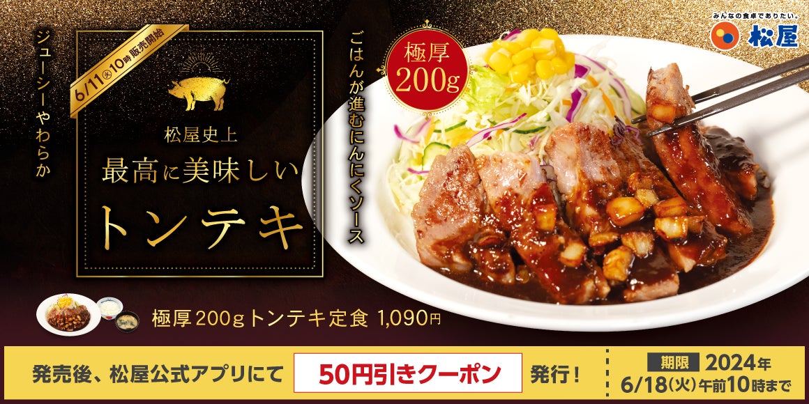 また、2024年6月11日(火)10時~6月18日(火)10時までモバイルクーポンにてご注文いただくと、「極厚200Gトンテキ定食」が50円引きでお買い求めいただけます。この機会にぜひ、お召し上がりください。