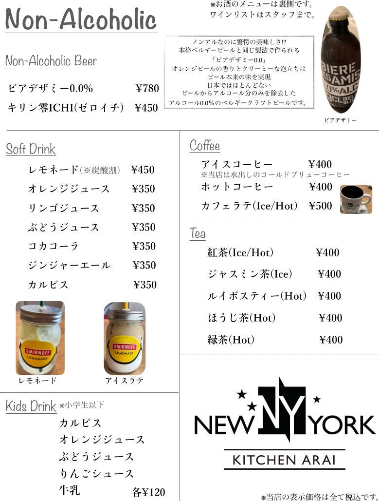 New York Kitchen ARAI(ニューヨークキッチンアライ)イオンスタイル碑文谷店7階(運営:株式会社RAVIPA 本社:東京都豊島区)では、ドリンクメニューをリニューアルいたします。ソフトドリンクやアルコール類も種類豊富にご用意しております。
