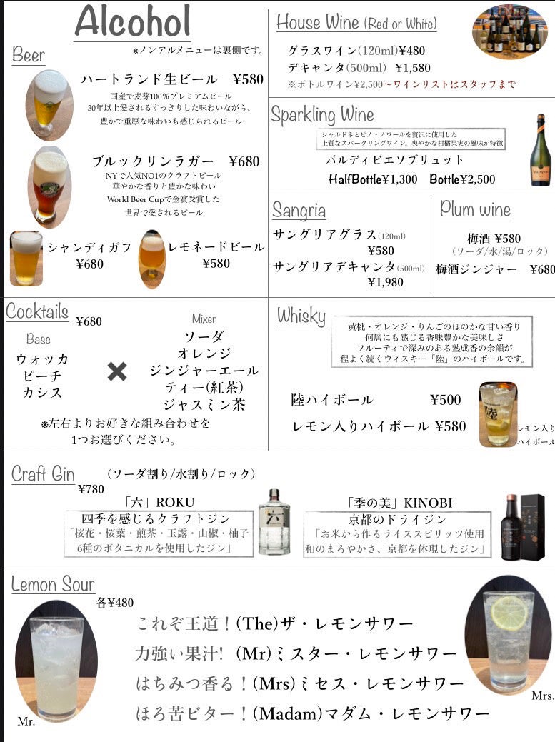 ランチやディナー、パーティーイベントなどでも楽しめる種類豊富なドリンクメニューとなっております。