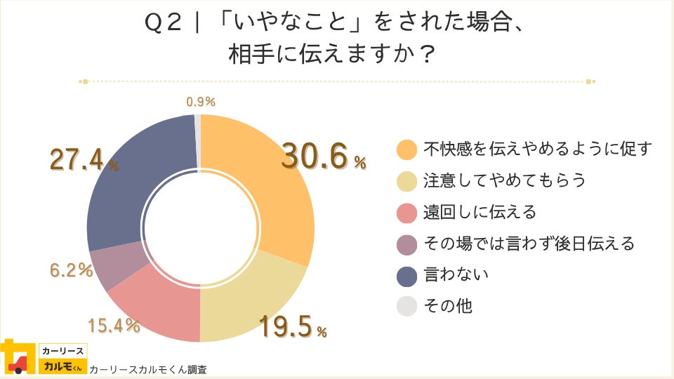続いて、いやなことをされた場合にその場で相手に伝えるか聞いたところ、「不快感を伝えやめるように促す」が30.6%で最多となり、「注意してやめてもらう」の19.5%と合わせると、約半数がその場で意思表示をすることがわかりました。