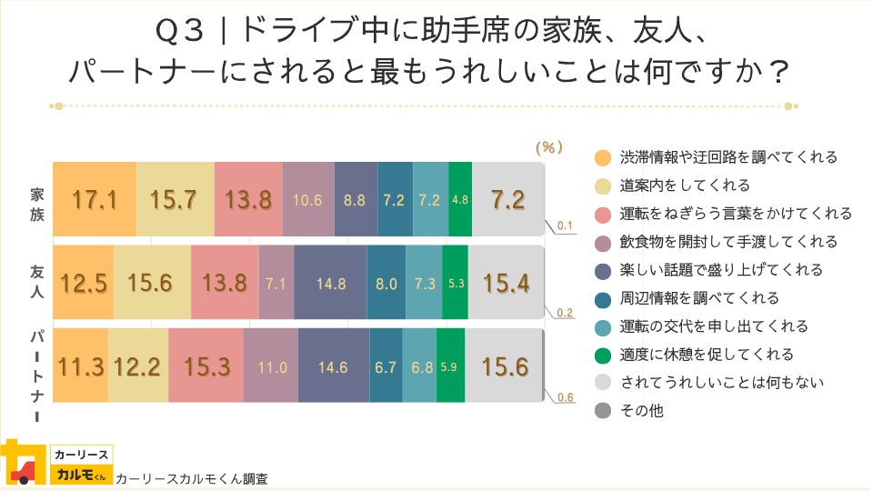 次いで多かったのは、家族では「道案内をしてくれる」の15.7%、友人では「されてうれしいことは何もない」の15.4%、パートナーでは「運転をねぎらう言葉をかけてくれる」の15.3%でした。