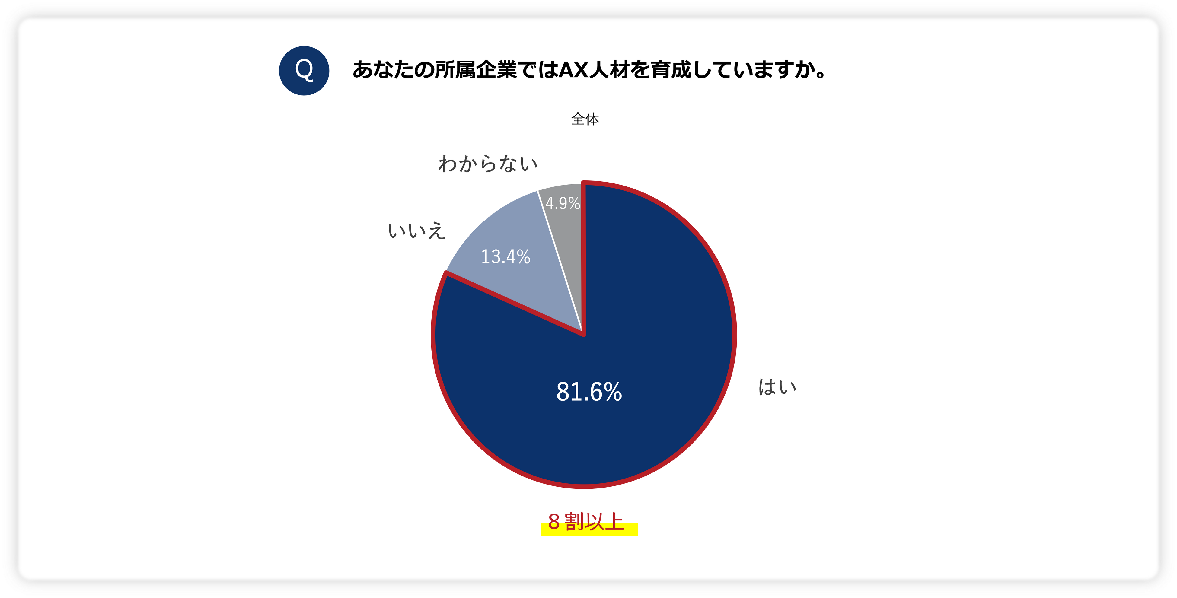 所属企業においてAX人材を育成しているか尋ねたところ、8割以上の企業が育成していることが分かり、全体として、AX人材の育成に対して積極的に取り組んでいる姿勢が見受けられます。
