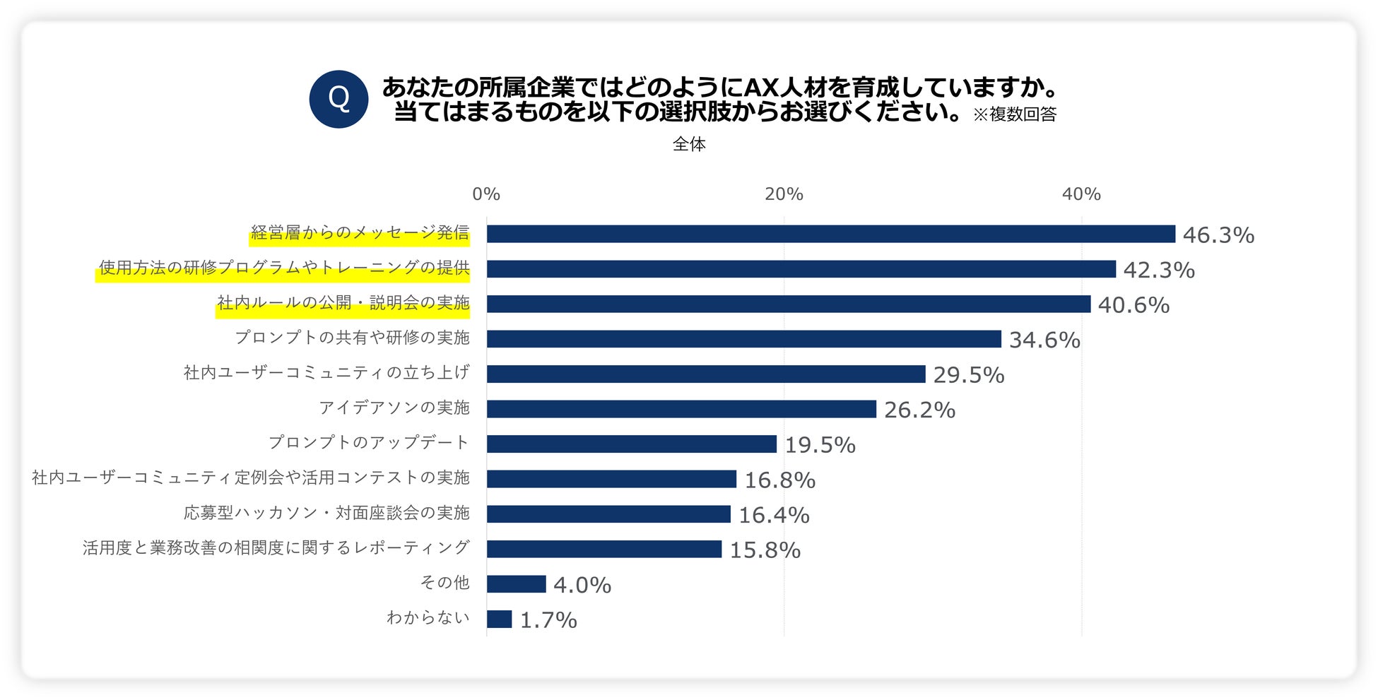 また、AX人材に対して、どのように育成をしているか尋ねたところ、全体1位が「経営層からのメッセージ発信」(46.3%)、2位「使用方法の研修プログラムやトレーニングの提供」(42.3%)、3位「社内ルールの公開・説明会の実施」(40.6%)となりました。