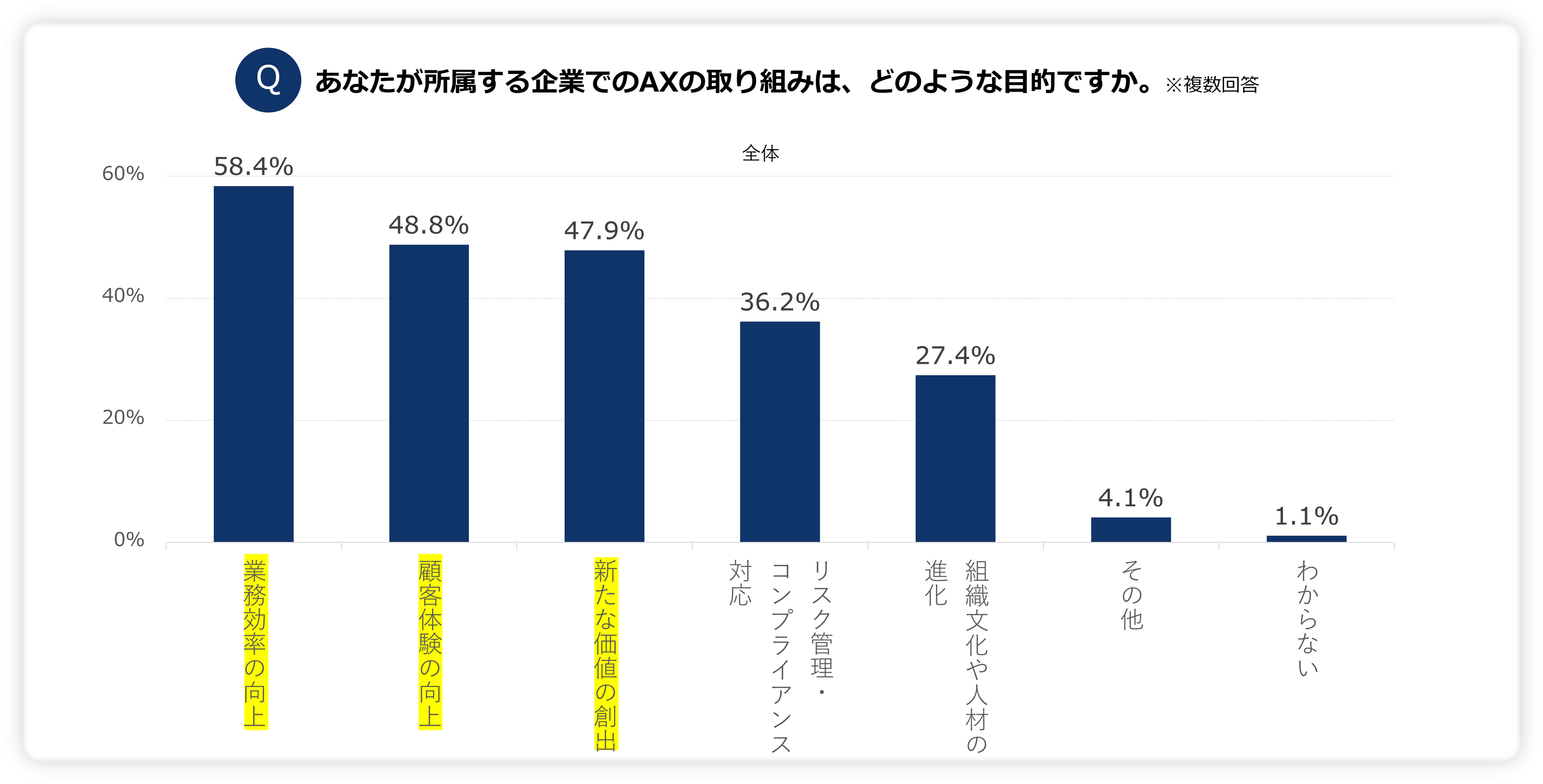 所属企業が取り組むAXの目的について尋ねたところ、全体1位は「業務効率の向上」(58.4%)、2位「顧客体験の向上」(48.8%)、3位「新たな価値の創出」(47.9%)となりました。