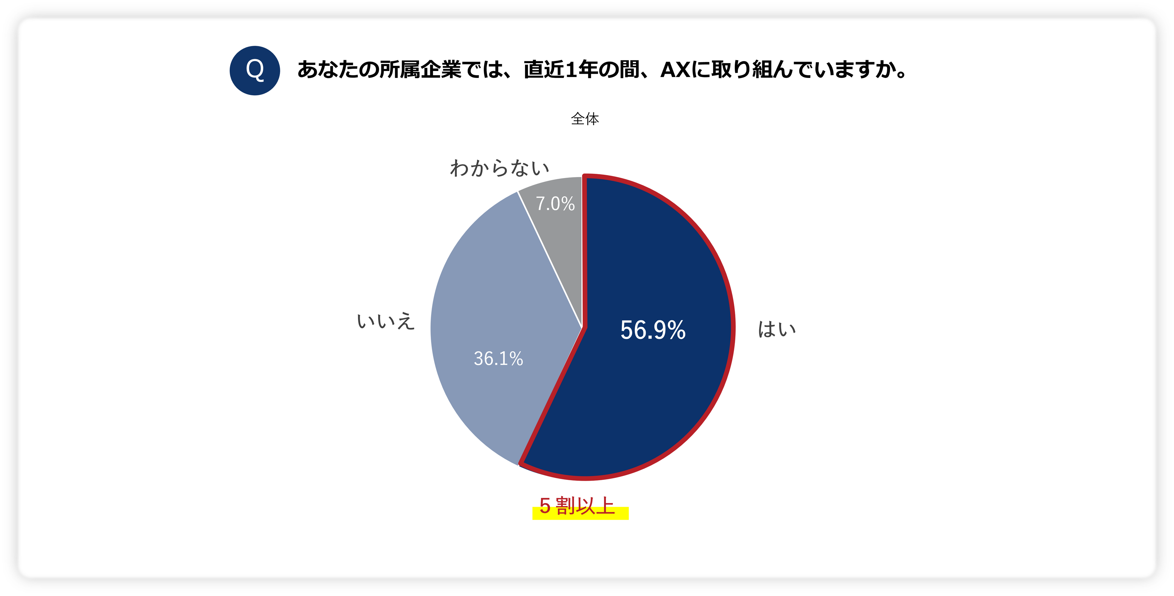 所属企業において、「直近1年の間で、AXに取り組んでいますか︖」と尋ねたところ、「はい」との回答は、56.9%と半数以上が取り組んでいる実態が明らかになりました。