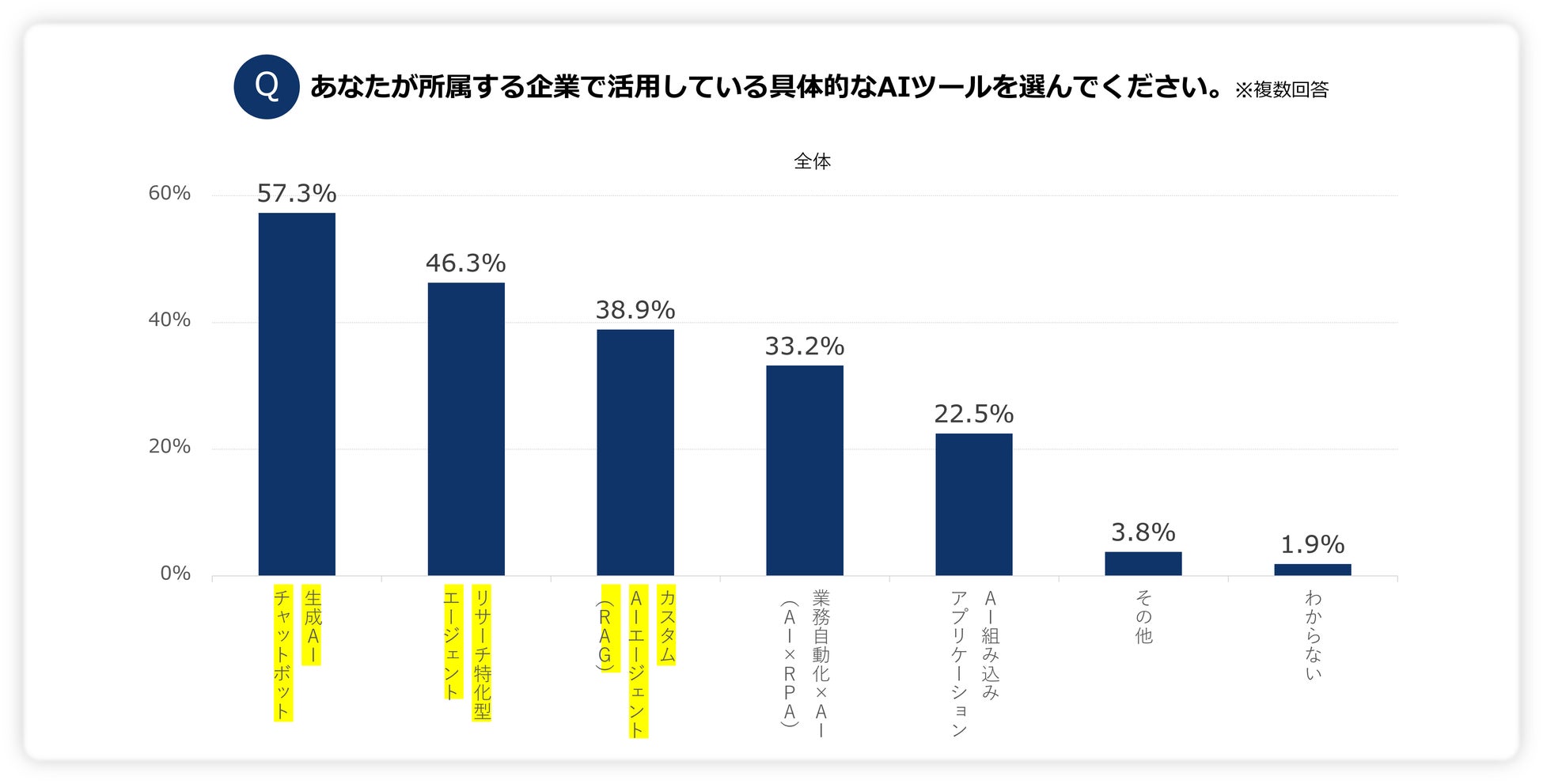 全体結果からは、多くの企業が生成AI・チャットボットなどの対話型ツールを中心に活用している一方、カスタムAIエージェント導入などより先進的なツールにも積極的に取り組んでいることが分かりました。