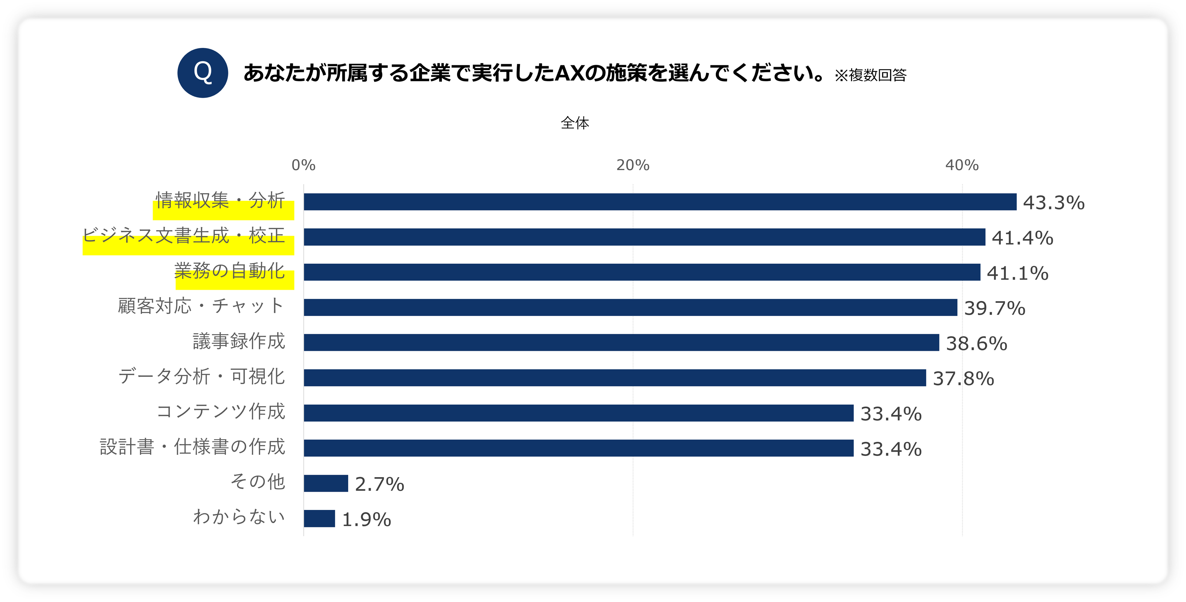所属企業が実行したAXの施策について尋ねたところ、全体1位は「情報収集・分析」(43.3%)、2位「ビジネス文書作成・校正」(41.4%)、3位「業務の自動化」(41.1%)となりました。