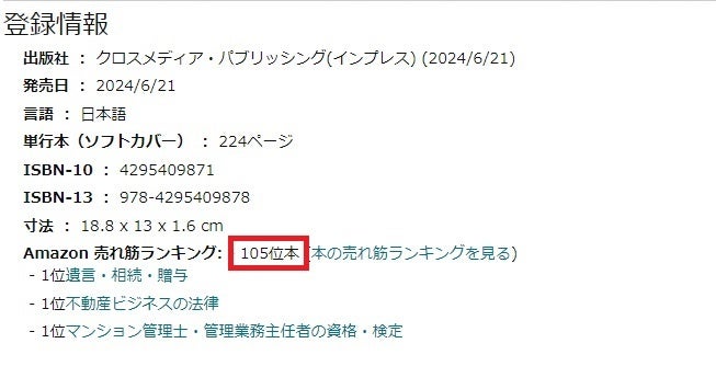 ◆告知後はAmazonカテゴリランキング「遺言・相続・贈与」「不動産ビジネスの法律」「マンション管理士・管理業務主任者の資格・検定」で1位を獲得しました。