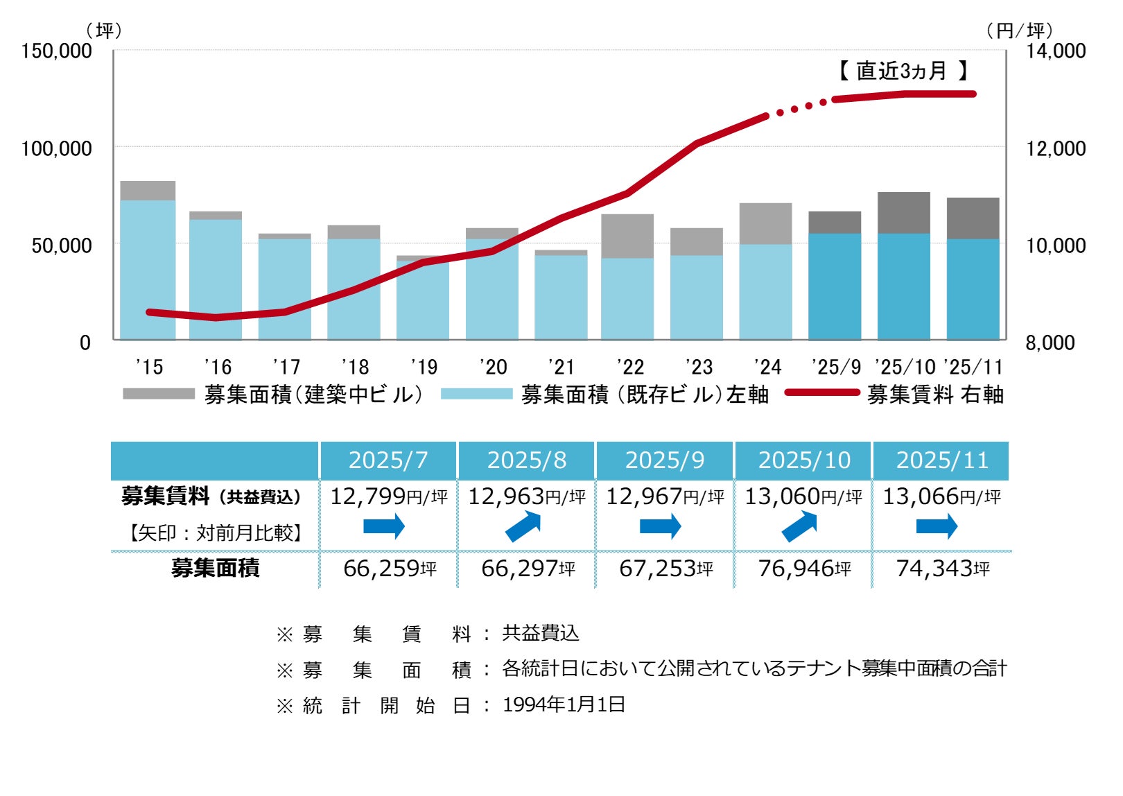 募集賃料は前月比プラス6円/坪の13,066円/坪と、6ヵ月連続の上昇となった。統計開始以来の最高値更新が継続している。