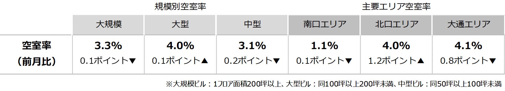 空室率は前月比マイナス0.05ポイントの3.36%と、2ヵ月連続で小幅な低下となった。主要エリアでの拡張移転や新規開設等で空室消化が進んでいる。エリア別では「北口」が前月比プラス1.2ポイントと大幅に上昇し、9ヵ月ぶりで4%台となった。潜在空室率は前月比マイナス0.30ポイントの4.81%だった。