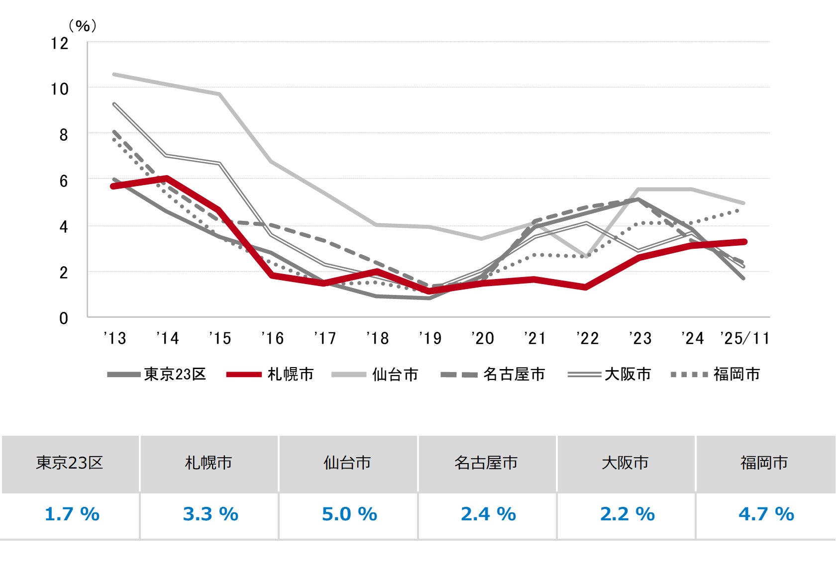 三幸エステート株式会社(本社:東京都中央区、取締役社長:福島正二郎)は、2025年11月度の札幌市オフィス賃貸状況(空室率&現空面積:全規模、募集賃料&募集面積:全規模、規模別空室率、主要エリア※1空室率:全規模)および全国6大都市(東京・札幌・仙台・名古屋・大阪・福岡)の大規模ビルのマーケットデータをまとめた「オフィスマーケット2025年12月号札幌」を公表します。