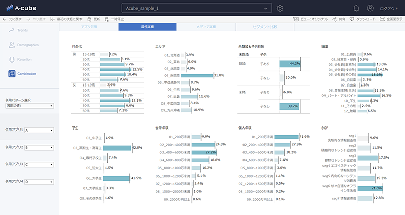 株式会社マクロミル(本社:東京都港区、代表執行役社長 グローバルCEO:佐々木徹 以下、当社)は、アプリ利用実態を分析・提供するサービス「A-cube -Actual AppLog Analyze-(以下、A-cube)」において、アプリの利用状況をスピーディかつ的確に把握できる新たな機能「A-cube Dashboard(以下、ダッシュボード)」を開発しました。当社が保有する豊富な属性データを用いた分析結果をダッシュボード上でグラフ表示し、手元で直感的に仮説構築・検証を行うことが可能です。