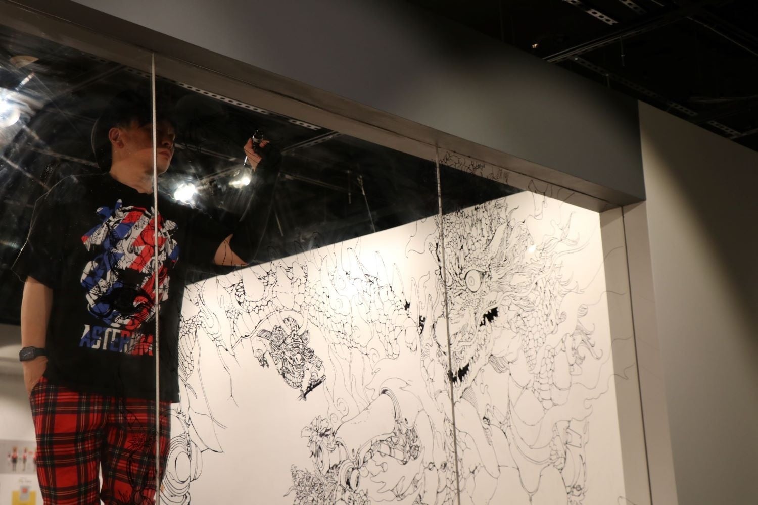 もう一つの目玉はギャラリー内でのライブドローイングパフォーマンスで、ギャラリースペースの真ん中に特別ステージをセットアップ、透明のミューラルにライブで絵を描くことによって来館者は表と裏の両方からAckyの制作過程を見学することができます。