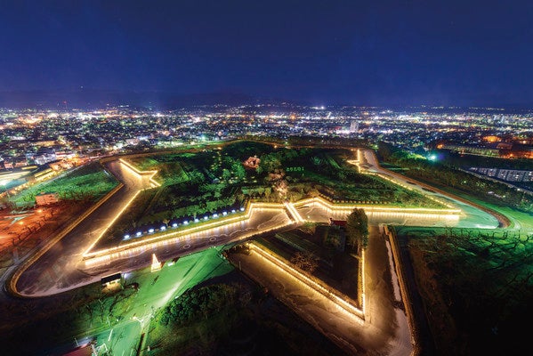 「五稜星の夢」は、国の特別史跡である五稜郭の堀を、約2,000個の電球で彩るイルミネーションイベントです。五稜郭タワーの展望台から見下ろすのが定番で、冬の夜に巨大な星形が浮かび上がる景観は、絶景そのもの。