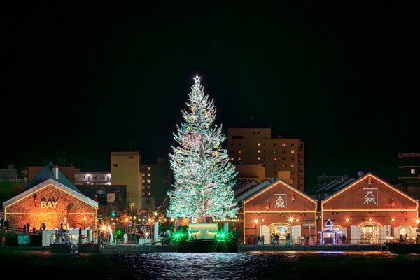異国情緒あふれる港町・函館で、ロマンチックなクリスマスの雰囲気を味わえる「はこだてクリスマスファンタジー」。赤レンガ倉庫群前の海上に浮かぶ巨大なクリスマスツリーは、姉妹都市であるカナダのハリファックス市から贈られたものです。