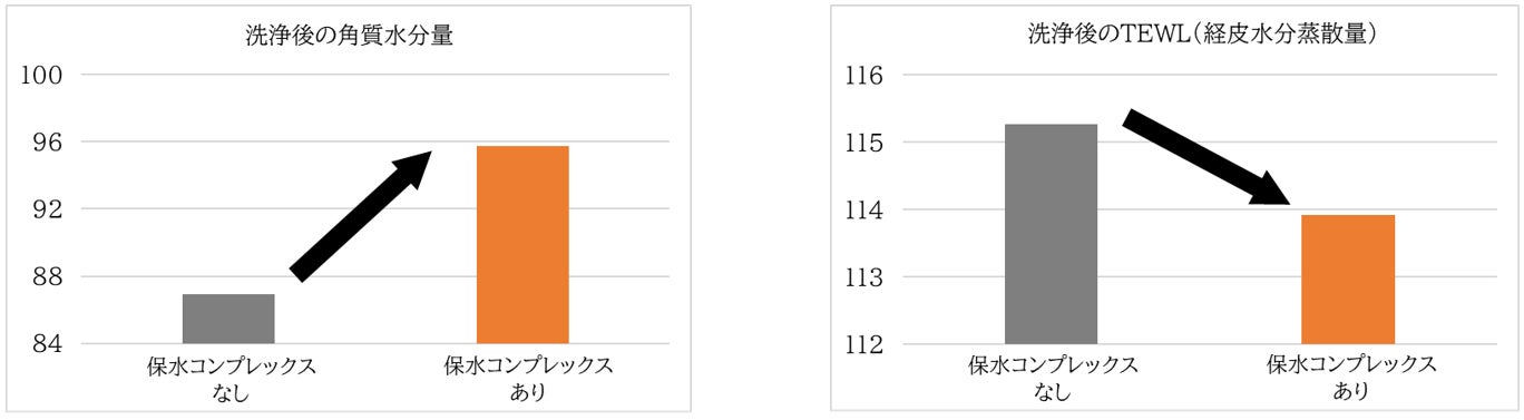 肌のキメの改善には保湿が有効であることが知られていますが、皮膚洗浄後はラメラ構造が乱れ急激に水分が奪われるため、肌のキメも乱れてしまいます。本研究では、加齢によりくすんだお肌の保水力を上げることで、キメを整える洗浄アプローチに着手しました。官能評価において、洗浄後でも保水実感のある多価アルコールや糖類などから候補成分を選定し、洗浄前後での角質水分量とTEWL(経皮水分蒸散量)を測定しました。その結果、ポリエチレングリコール(PEG-20)、ラフィノース、ジプロピレングリコール(DPG)の3成分の組み合わせ「保水コンプレックス」により、皮膚洗浄後であっても角質水分量上昇とTEWL低下が確認されました(図1)。