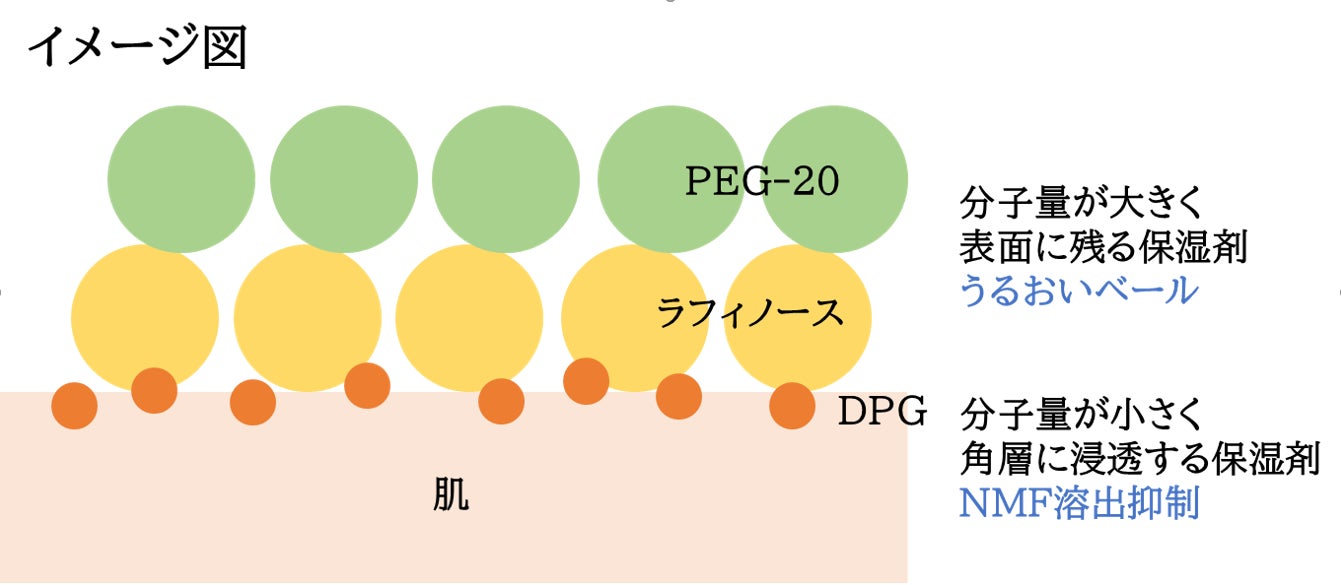 PEG-20とラフィノースは、皮膚洗浄後でも肌表面にベール状に残り、水分を留める効果が期待できます。また、DPGは角質細胞中の天然保湿因子(NMF)の溶出を防ぐことができます(図2)。