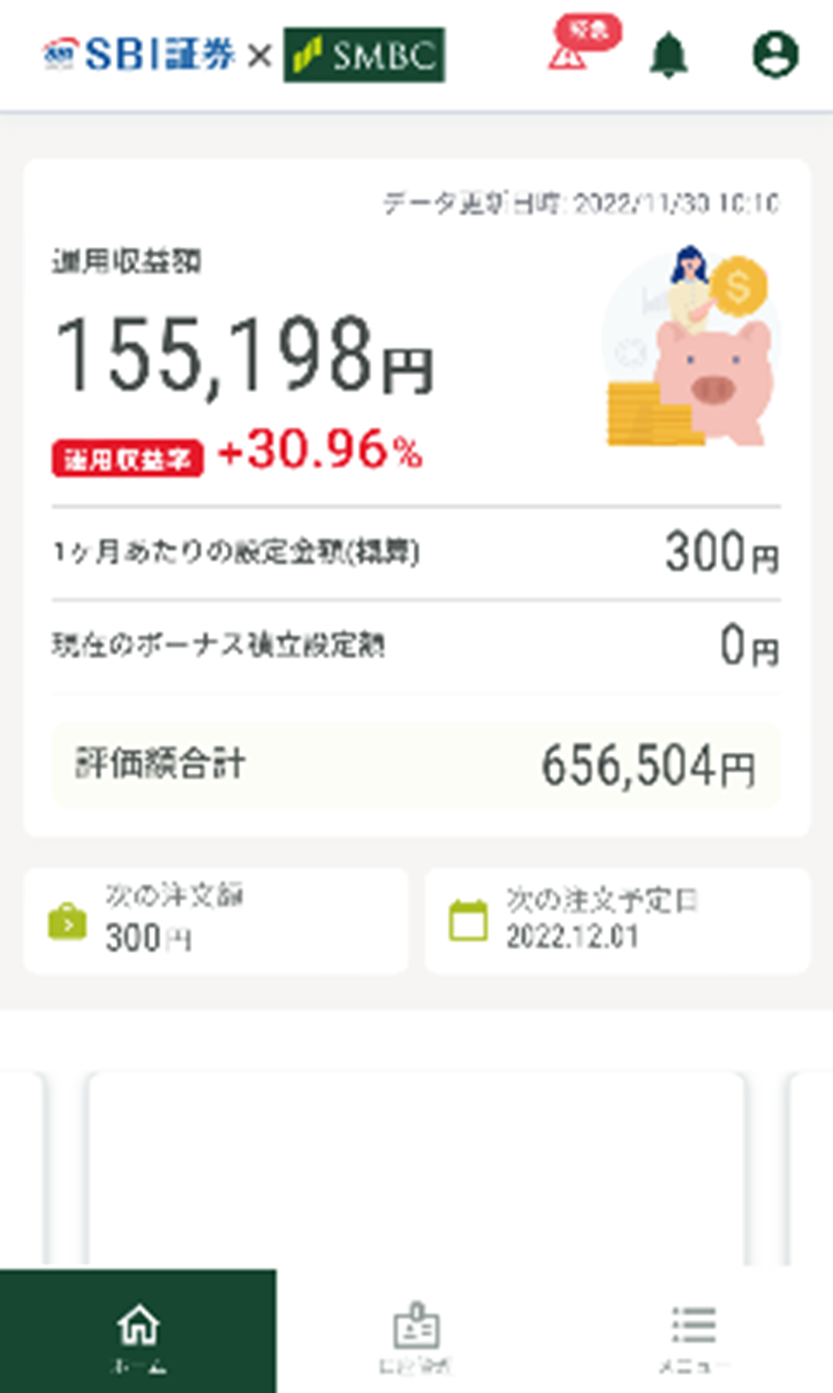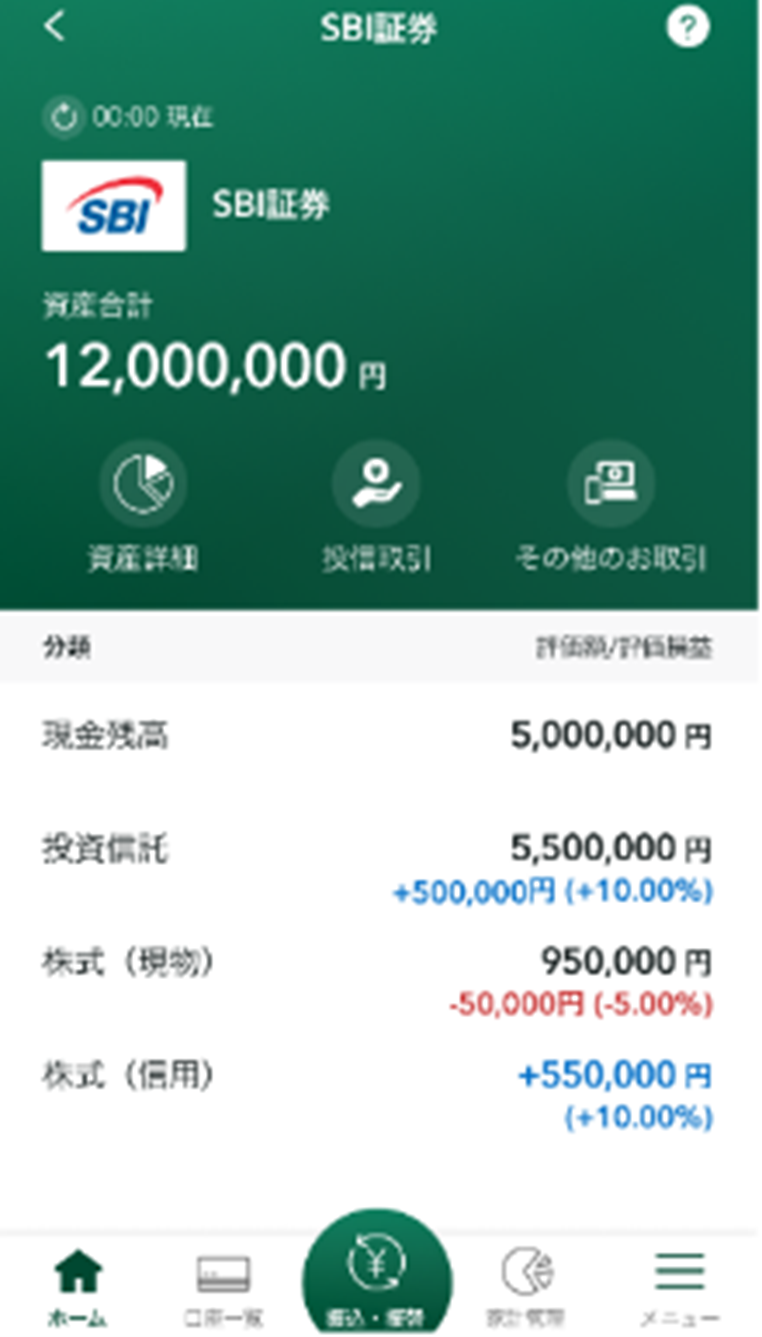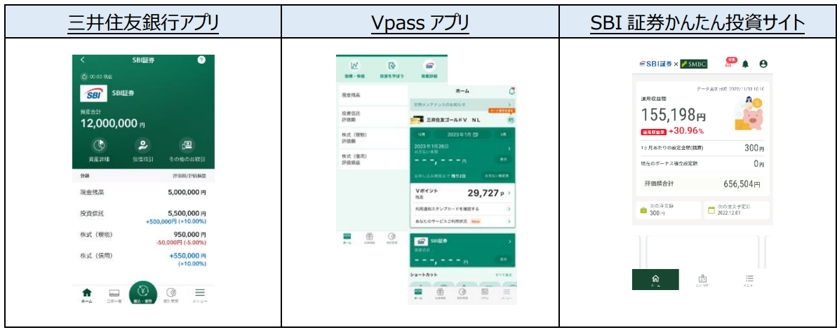 三井住友銀行アプリ及びVpassアプリ上でSBI証券の口座残高・損益状況の確認や「SBI証券かんたん投資サイト」にスムーズに遷移し、SBI証券が取り扱う投資信託をお取引いただけます。