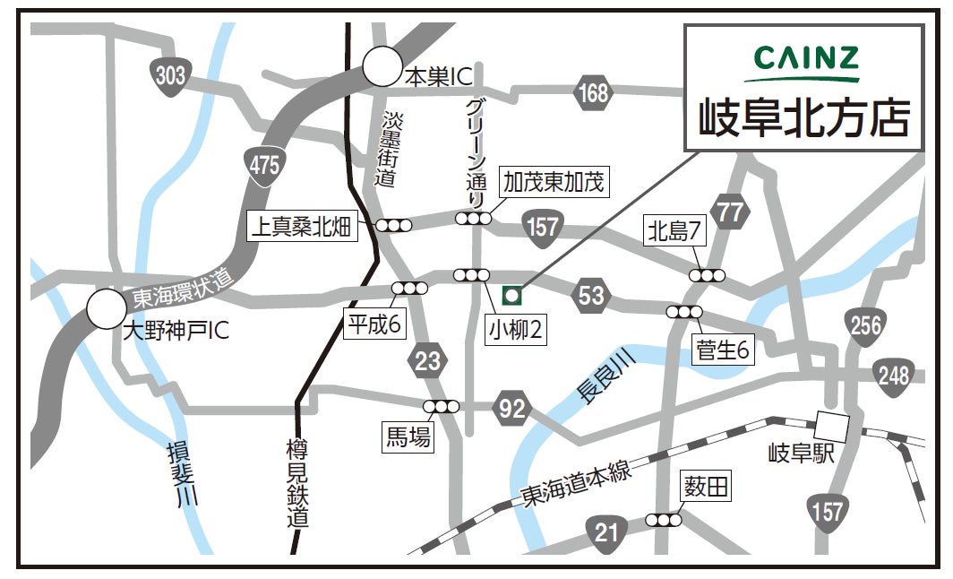 その価値を地域の皆様に届ける拠点として、今回カインズ 岐阜北方店を出店します。北方町は岐阜県の南西部、濃尾平野の北部に位置し、古くから商業や文化の拠点を担ってきた、人口約1万8,600人のまちです。現在では、国道157号や主要地方道を中心に、岐阜県の中心的な都市である岐阜市や大垣市、名古屋市方面へのアクセスにも優れており、歴史と文化が調和しながら発展を続けています。商業施設の集積も進む、岐阜市近郊エリアに位置するくらしの中核を担う地域です。
