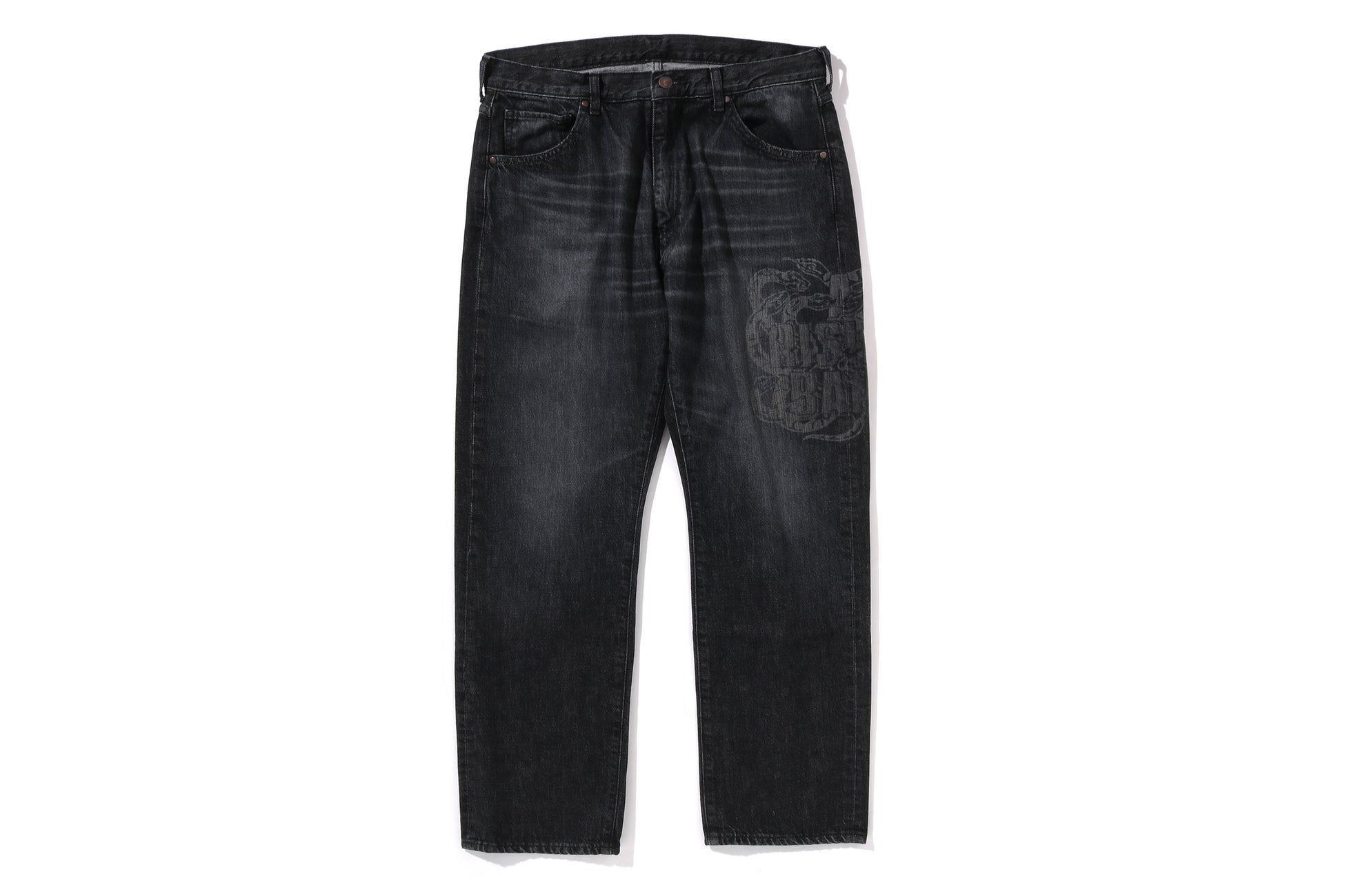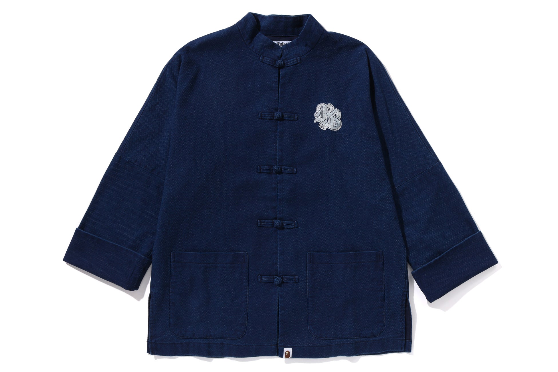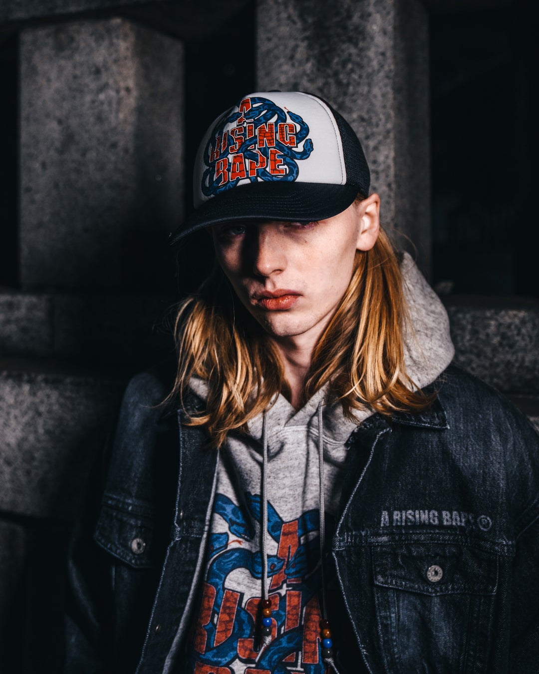 インディゴデニムを使用したチャイナジャケットの背面にも大きくAPE HEADと蛇のグラフィックをレーザープリントしました。 メッシュキャップは、フロントにはみ出るほど大胆にグラフィックをプリント。