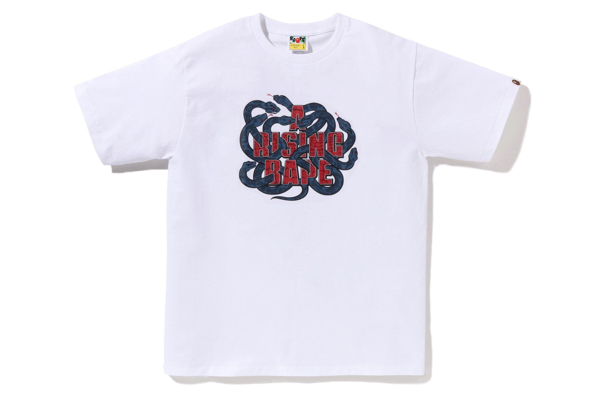 Tシャツはヤマタノオロチを、ロングスリーブTシャツはAPE HEADと蛇を、それぞれ“A RISING BAPE”のタイポグラフィと組み合わせたグラフィックがスタンバイ。箔押しプリントで表面には蛇の鱗からインスピレーションを得た文様を描きました。ホワイトとブラックの2色展開。