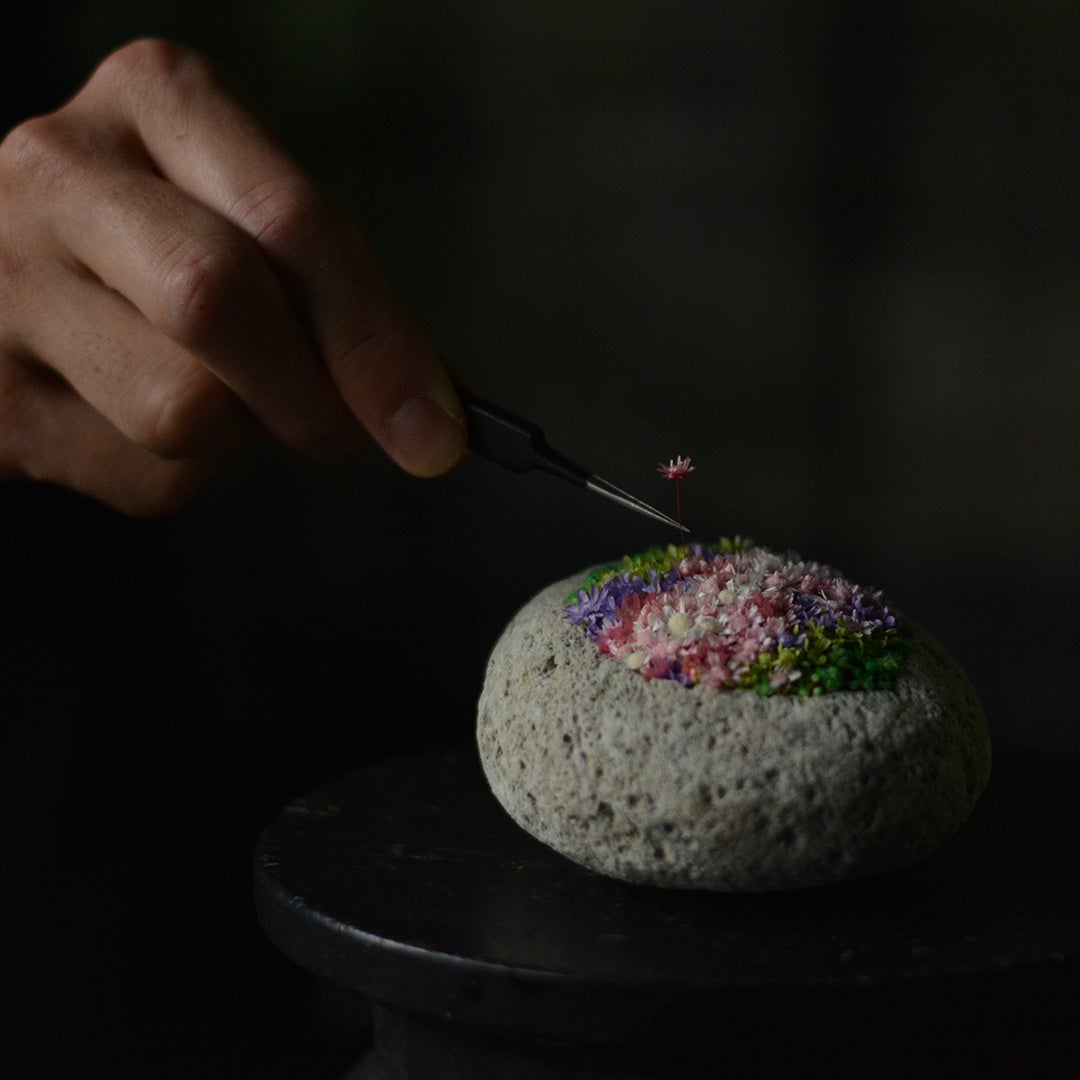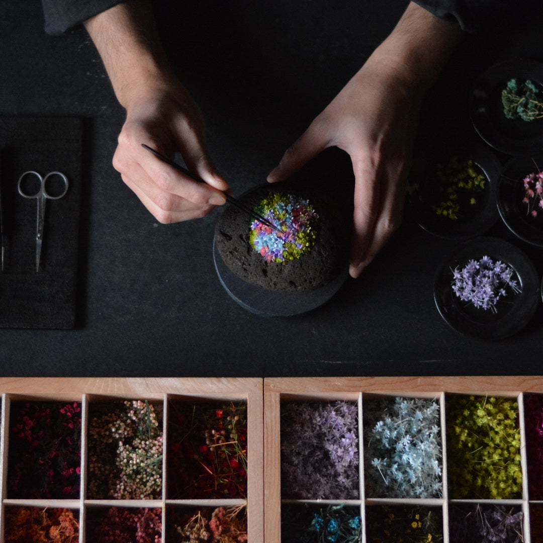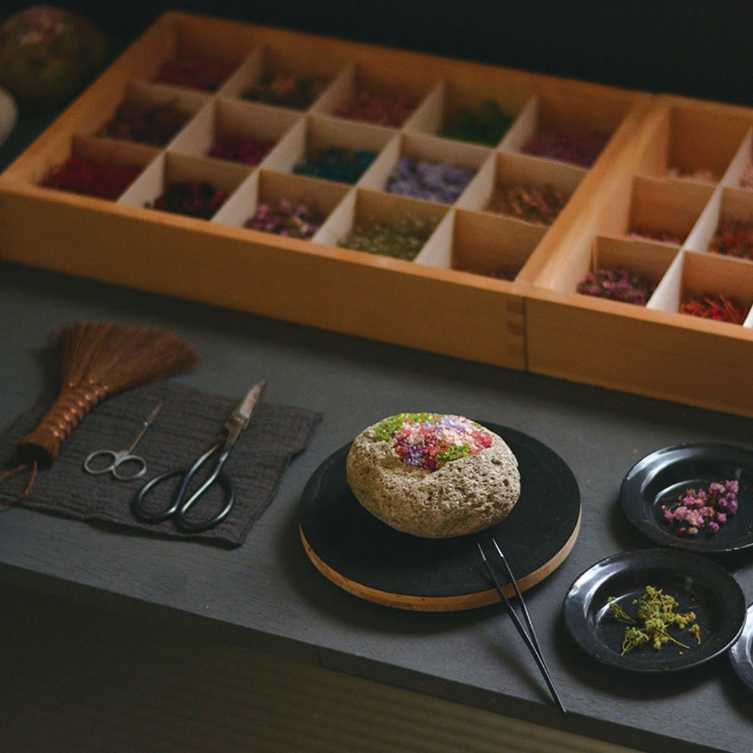 プリザーブドフラワーやドライフラワーを使用したアートオブジェ〈景色風〉を制作します。美術作家・花道家の亀井紀彦氏の丁寧なアドバイスのもと、じっくりと小さな世界に没頭。色とりどりの花材を自分で選んで作品と向き合う、瞑想のような心穏やかな時間をご堪能ください。