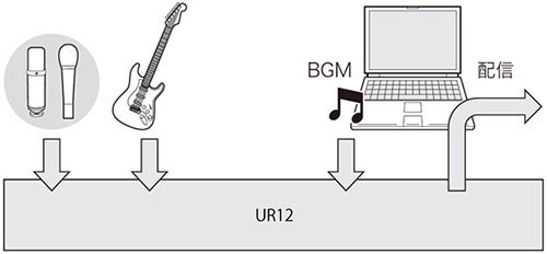「ループバック機能」は、インターネット経由の配信時に便利な機能です。本体の入力端子に入力されているオーディオ信号(マイク、ギターなど)と、コンピューター内で使用中のソフトウェアから再生されている BGM などのオーディオ信号を本体内で2チャンネルにミックスし、コンピューターを通じてインターネットに配信することができます。
