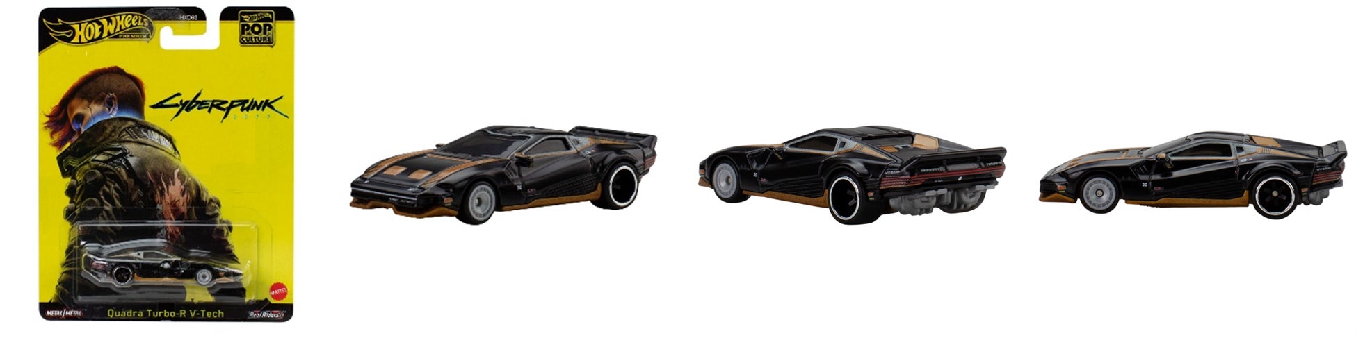 ポーランドのCDプロジェクト社が開発した人気ロールプレイングゲーム『サイバーパンク2077』から、「クアドラ ターボ-RV-テック」がホットウィールの新金型モデルとして登場します。2077年の世界を想定した近未来の舞台でプレイヤーを魅了する本作では、アメリカのクワドラ社が2058年に発売したとされるスポーツカーとして登場し、近未来的なデザインの中に、1970〜1990年代のスーパーカーを思わせるクラシックな雰囲気をあわせ持っています。退廃的でスタイリッシュなフォルムがサイバーパンクの世界観を感じさせ、ボディの細部や窓枠の彩りは立体印刷で仕上げています。前後でサイズの異なるタイヤが力強い走りを想起させるなど、細部までこだわりが詰まった1台です。