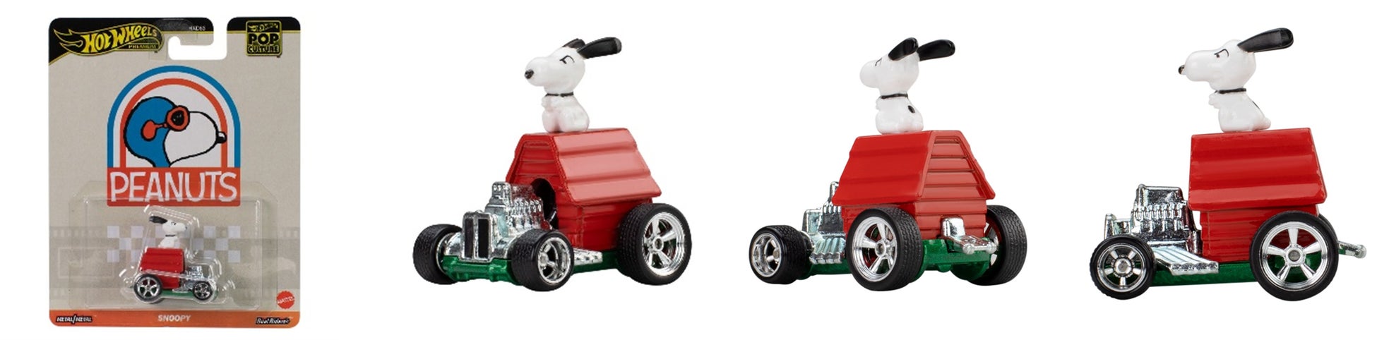 1950年に新聞連載としてスタートした『ピーナッツ』に登場する「スヌーピー」が、ホットウィールから登場します。チャーリー・ブラウンの愛犬スヌーピーが寝そべる赤い犬小屋と、いかにもアメリカらしいホットロッドをドッキングしたオリジナルデザインカーで、アメリカらしい力強さと遊び心をあわせ持った一台です。今回のポップカルチャー版では、金属製ボディのベースに本格的なゴム製タイヤを採用し、フロント部分には黒の彩りを加えるなど、細部まで丁寧に仕上げています。スヌーピーファンはもちろん、コレクションとしても楽しめる特別仕様です。