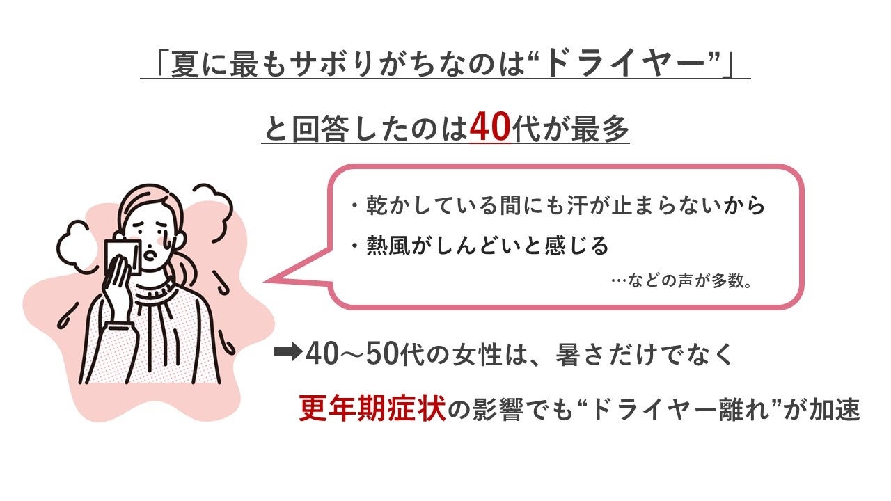 2025年の夏は、気象庁の発表によると全国的に平年を大きく上回る猛暑が予想されています。こうした中、「お風呂上がりのドライヤーが苦痛」「暑くて髪を乾かす気になれない」といった“ドライヤー離れ”が加速しており、特に女性を中心に不快感や負担感を訴える声が高まっています。さらに、40代以降の更年期世代の女性の中には、ほてりや発汗といったホットフラッシュの症状によって、ドライヤーの使用がより一層つらく感じられるケースもあり、ドライヤー離れの一因となっているようです。