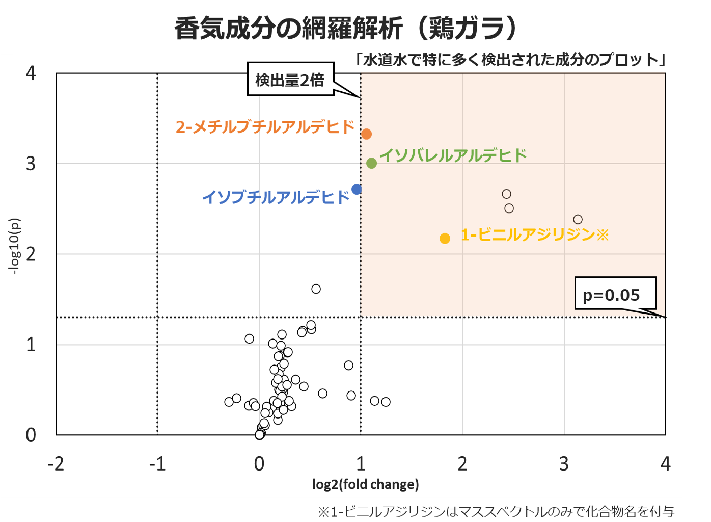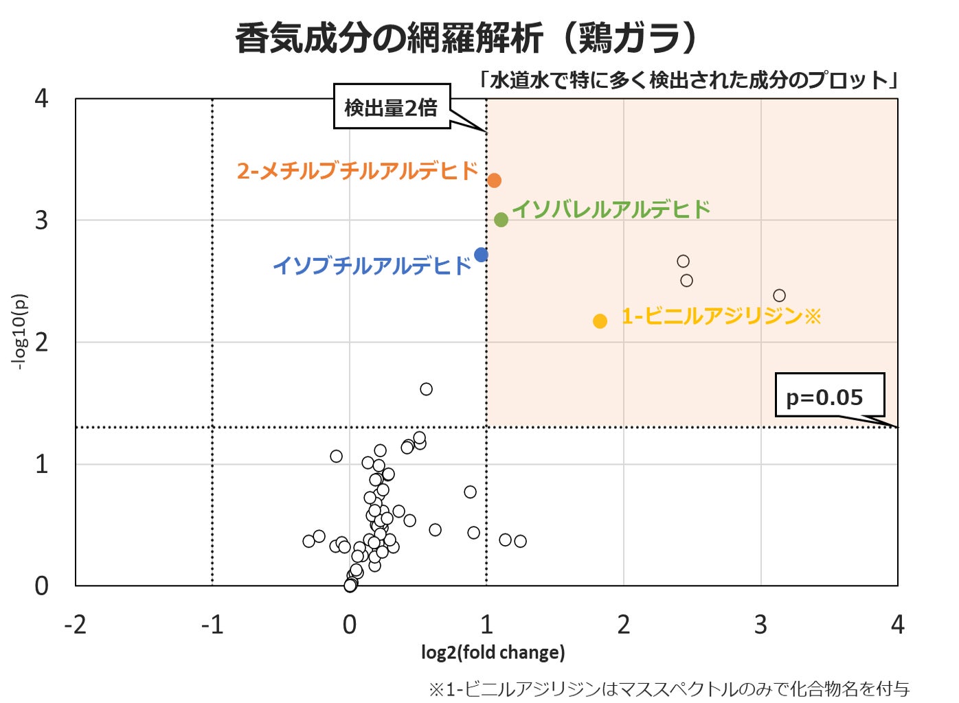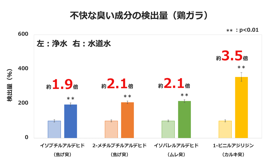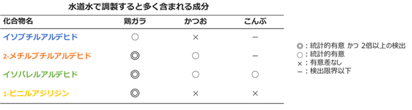 水道水および浄水で、鶏ガラ、かつお、こんぶの3種類の顆粒だしからそれぞれ調製しただしの香気成分を網羅的に比較しました。その結果、鶏ガラの場合、水道水では浄水と比べて不快臭の原因と言われている3種のアルデヒド類(イソブチルアルデヒド、2-メチルブチルアルデヒド、イソバレルアルデヒド)および1-ビニルアジリジンが多く検出されました。一方で、顆粒だし本来の香気成分には違いが見られませんでした。