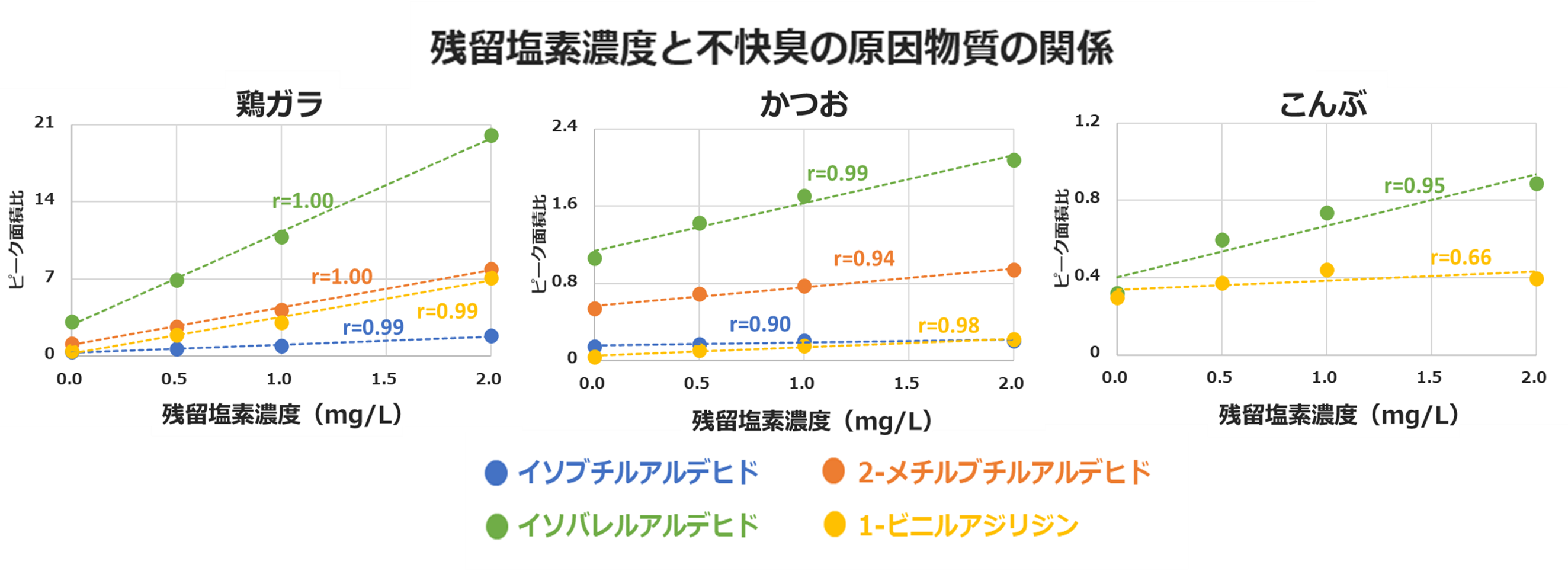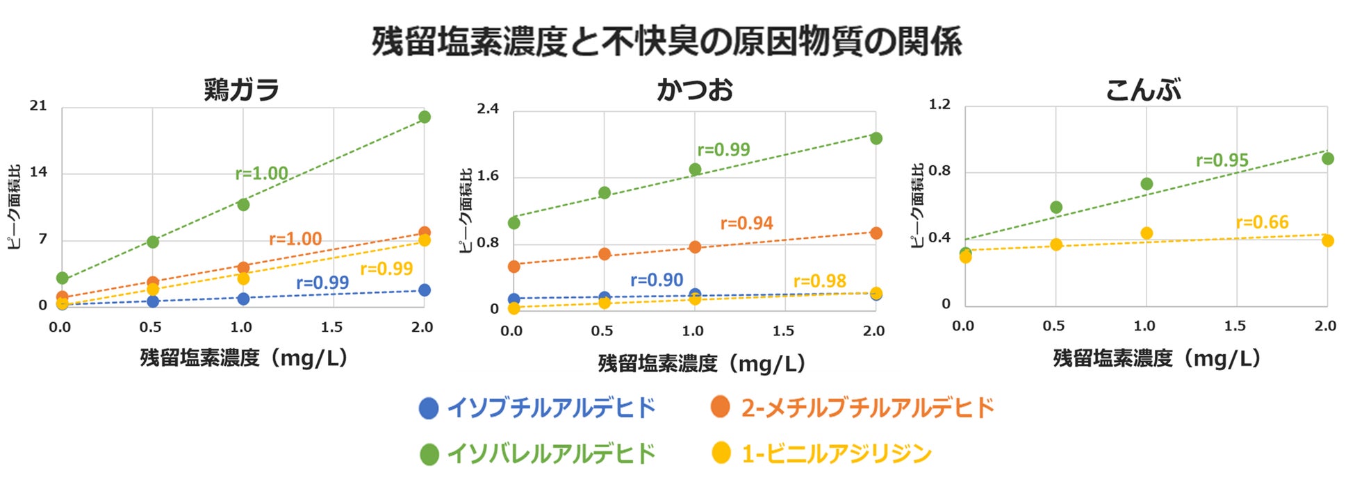 次に、水道水の場合で、不快臭が多くなる原因を調査しました。その結果、使用する水に含まれる残留塩素濃度の増加に伴い、鶏ガラ、かつお、こんぶのいずれにおいても不快臭の原因物質が増加し、水道水中の残留塩素が不快臭の原因物質の生成に関与していることが明らかとなりました。