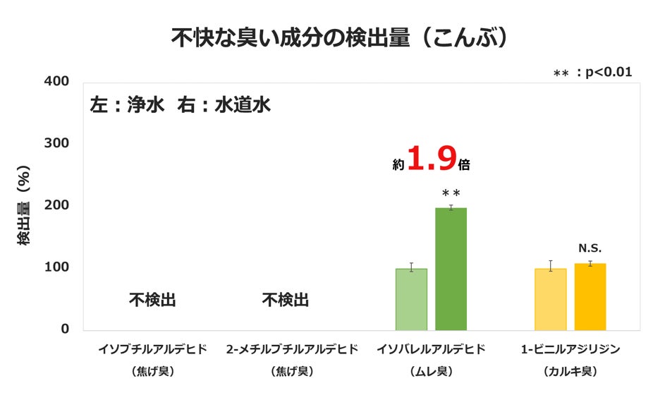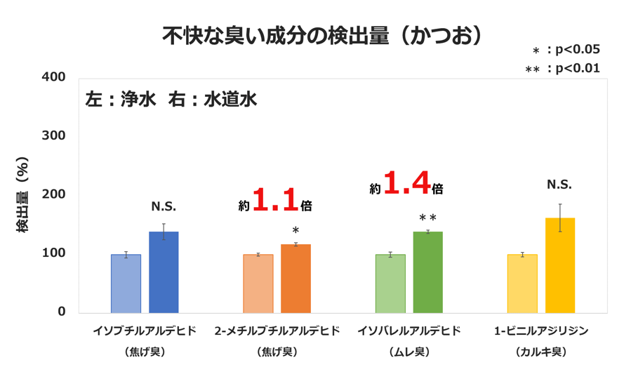 さらに、かつお、こんぶでも水道水の方が、アルデヒド類が多く検出されました。