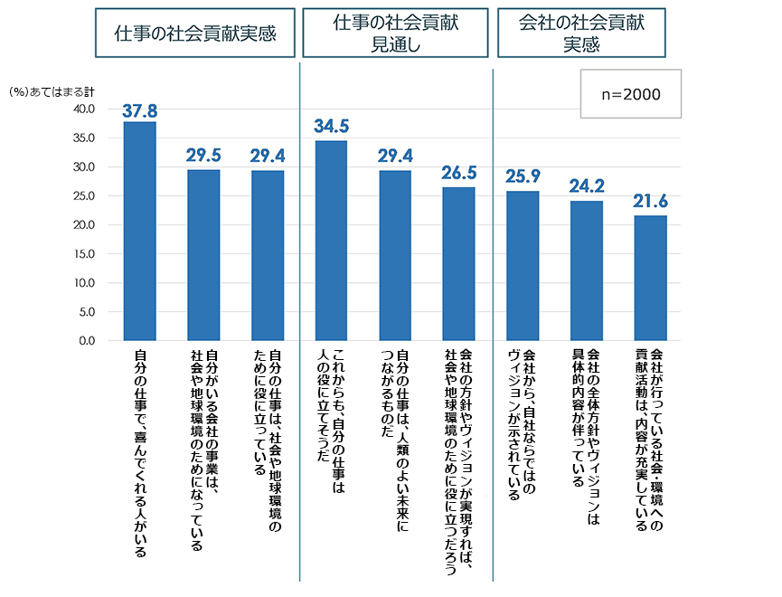- 今の仕事や会社の活動の社会貢献実感である「ソーシャル・レリバンス」が強い