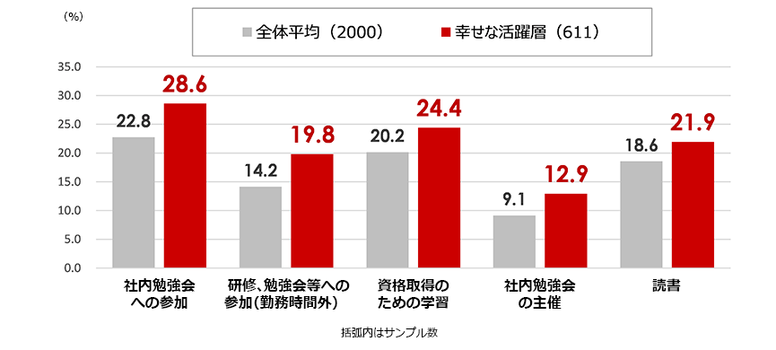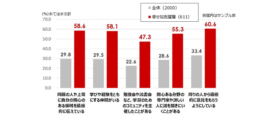 幸せな活躍層のソーシャル・ラーニングの具体的な行動割合は、全体平均のおよそ2倍。【図表4】