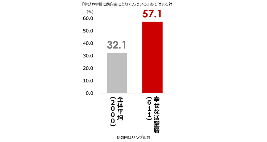 - 「学びや学習に前向きにとりくんでいる」人が全体と比べて1.8倍多い
