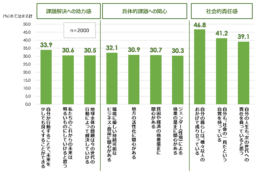 -「自分の暮らしは様々な人のおかげで成り立っている」という感覚は46.8%と高いが、「地球全体の問題は今の世代の行動によって解決していける」といった課題解決への効力感は3割程度と低め。 【図表6】