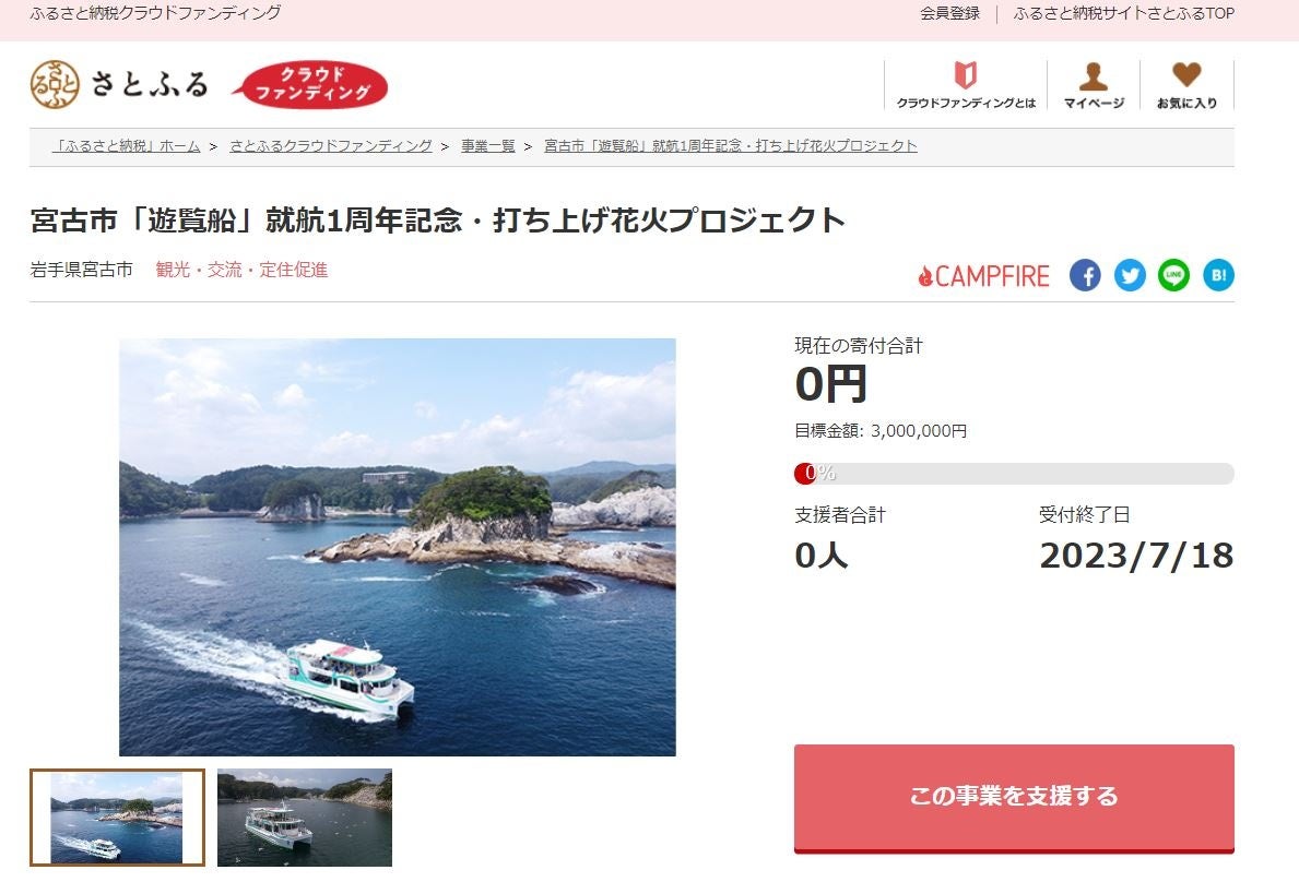 岩手県宮古市とさとふる、遊覧船運航再開1周年記念 感謝の花火打ち上げのため、寄付受け付けを開始