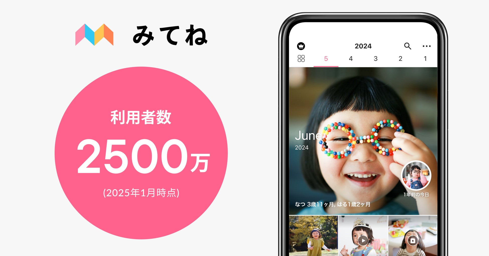 株式会社MIXI(東京都渋谷区、代表取締役社長 上級執行役員 CEO:木村 弘毅)が提供する子どもの写真・動画共有アプリ「家族アルバム みてね」(以下「みてね」)は、2015年4月のサービス開始から多くのご家族にご利用いただき、2025年1月12日(日)に世界累計利用者数が2500万人*1を突破したことをお知らせします。