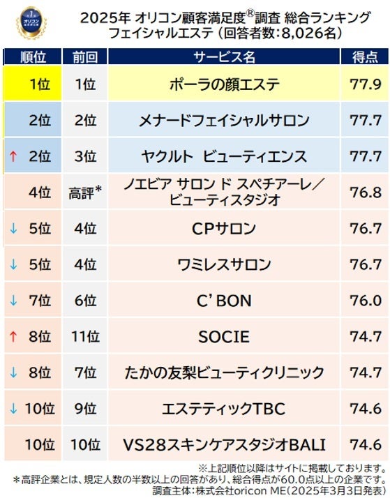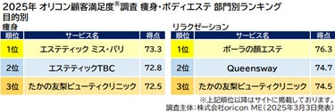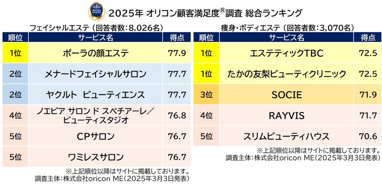オリコン株式会社(本社:東京都港区 代表取締役社長:小池 恒、略称:オリコン)は、グループ会社である株式会社oricon MEが、実際のサービス利用者を対象に第三者の立場で実施した『エステサロン(フェイシャルエステ/痩身・ボディエステ)』の顧客満足度調査の結果を、2025年3月3日(月)14時に「オリコン顧客満足度®」公式サイト内にて発表いたしました。