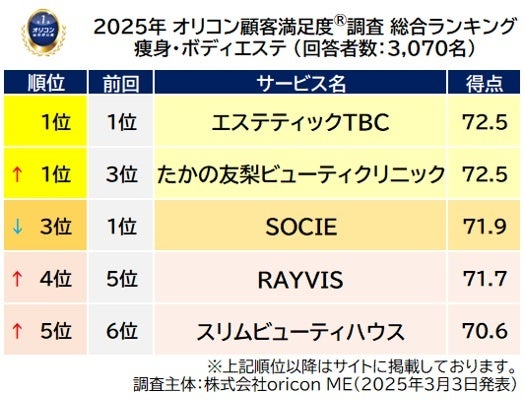 【エステティックTBC】と【たかの友梨ビューティクリニック】が同点総合1位