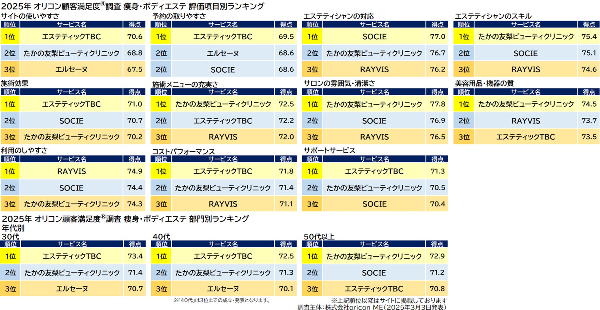 ■【エステティックTBC】と【たかの友梨ビューティクリニック】が同点総合1位