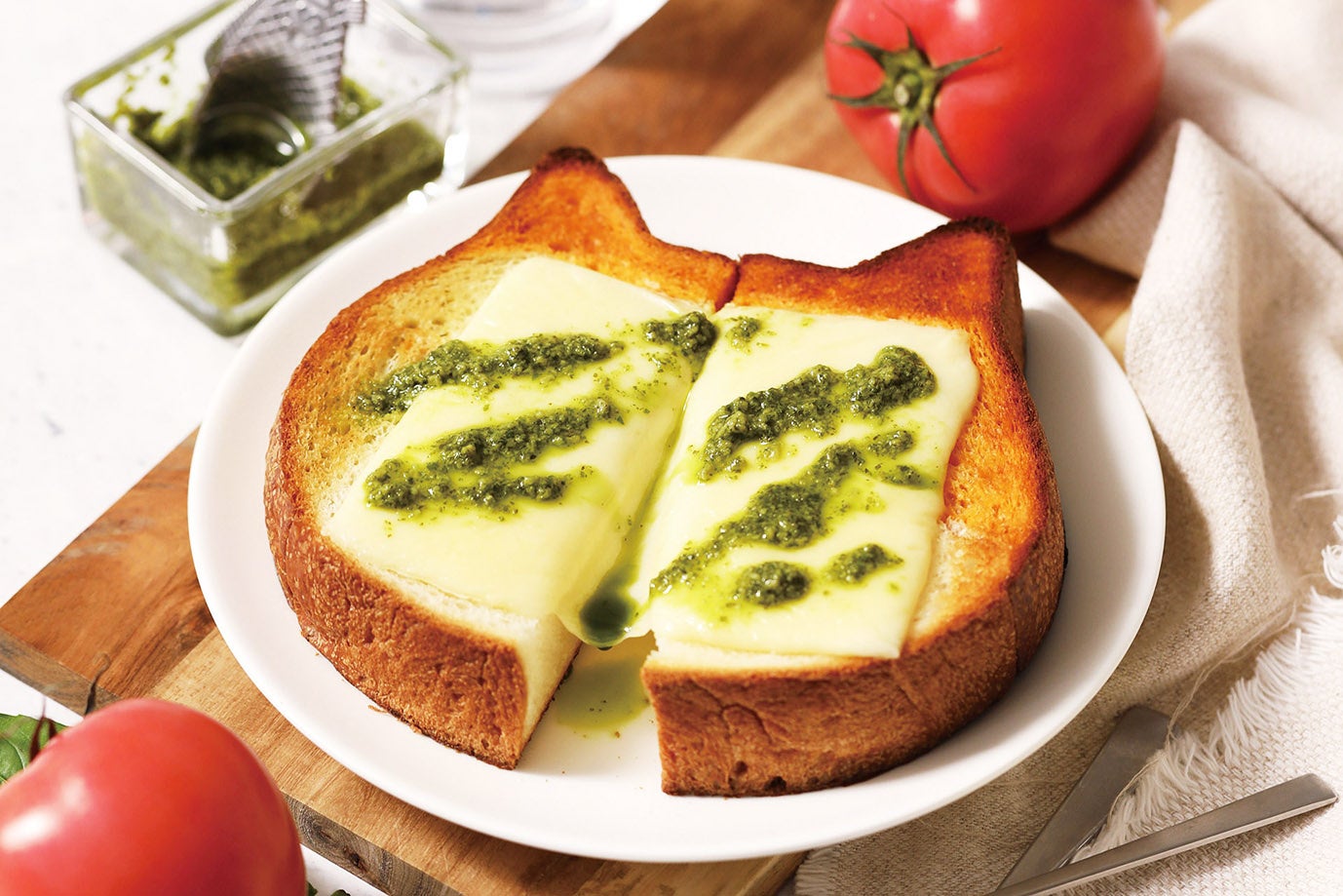 トマト風味の生地にはトマトパウダー、バジル風味の生地にはバジルペーストを練りこんで焼き上げているため、まるでイタリア料理を食べているかのような味わいが広がり、いつもと少し違うねこねこ食パンに。