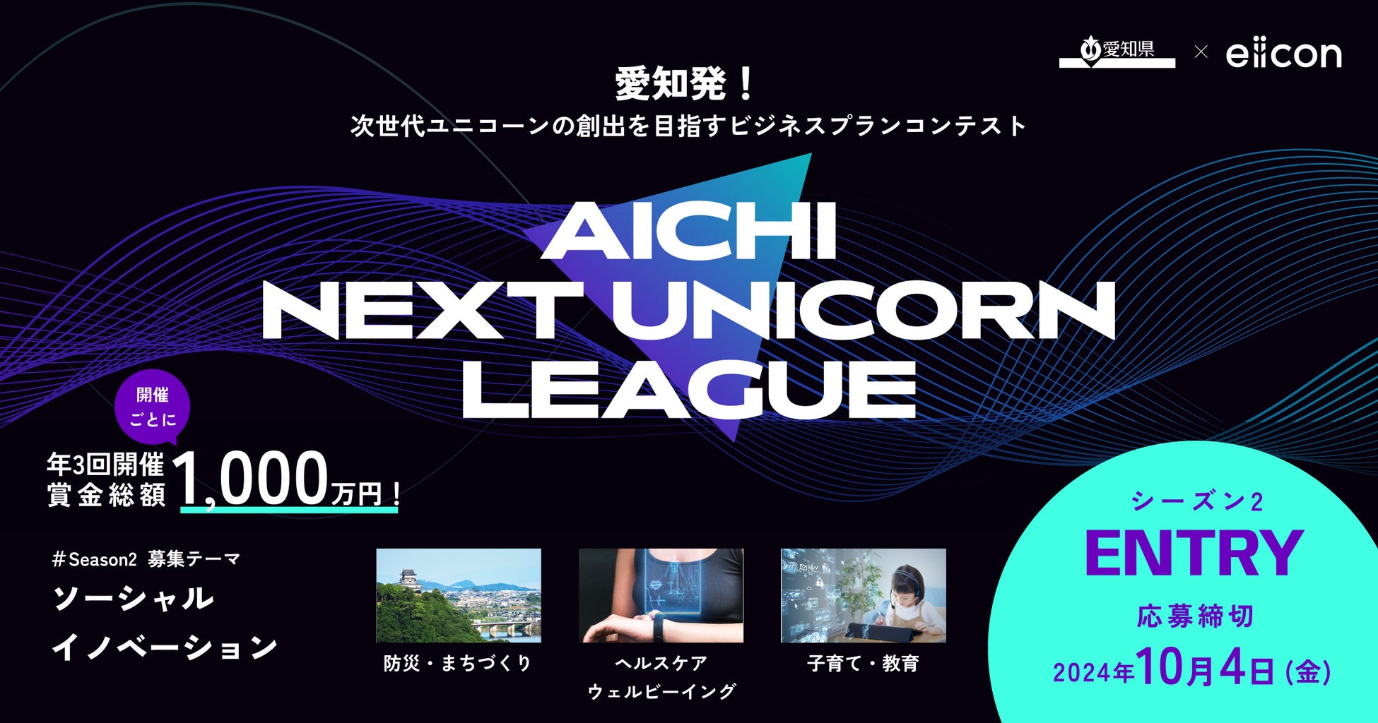 日本最大級のオープンイノベーションプラットフォーム「AUBA(アウバ)」を運営する株式会社eiicon(エイコン 本社所在地:東京都文京区後楽、代表取締役社長:中村 亜由子、以下「eiicon」)は、2024年8月19日より、愛知県とともに、愛知県からNextユニコーンの創出を目指すビジネスプランコンテスト『AICHI NEXT UNICORN LEAGUE(主催:愛知県、運営:eiicon、以下、本コンテスト)のシーズン2として「ソーシャルイノベーション」の課題を解決するビジネスプランの募集を全国から開始しました。