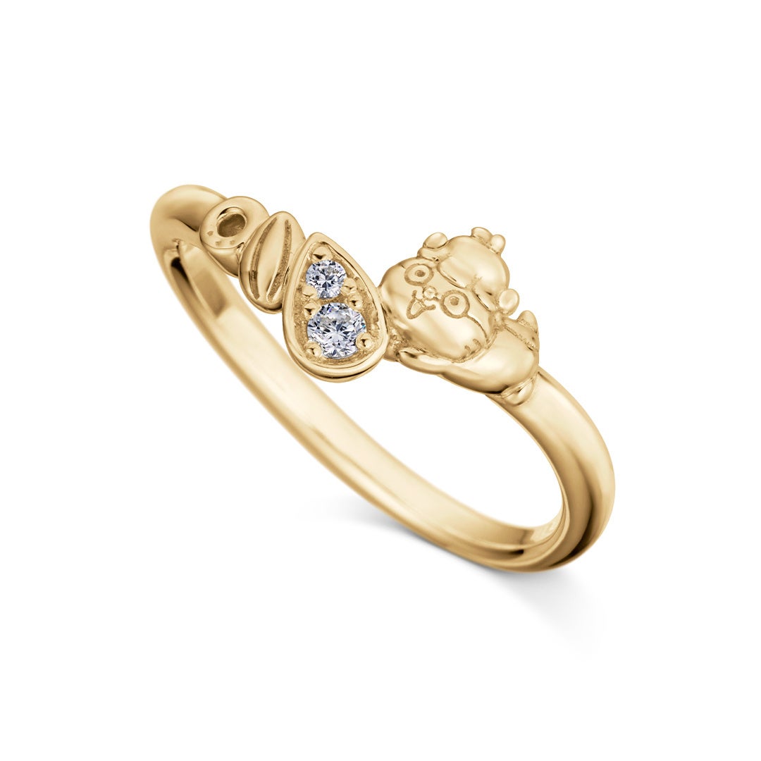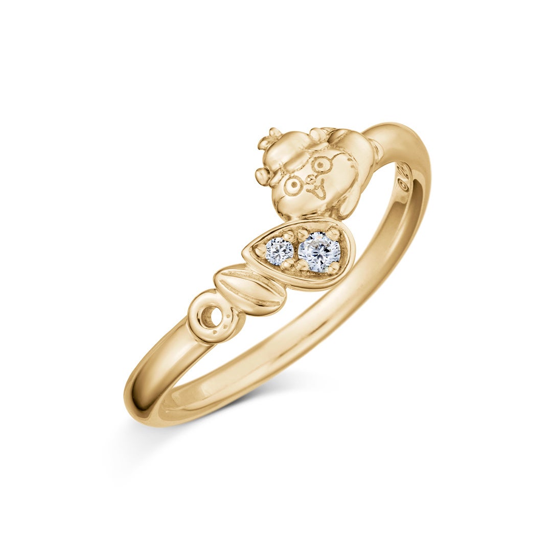 コロコロクリリンが特技の宝物集めをしている様子をリングに表現しました。 大好きなヒマワリのタネや、ドーナツに囲まれてとっても嬉しそう。 ヒマワリのタネにあしらった2石のストーンがキラッときらめき、手元を華やかに演出します。 トレードマークのお花の帽子や、表情、フォルムにもこだわったリングはいつでもクリリンの可愛らしさをお手元に感じていただけます。 |
