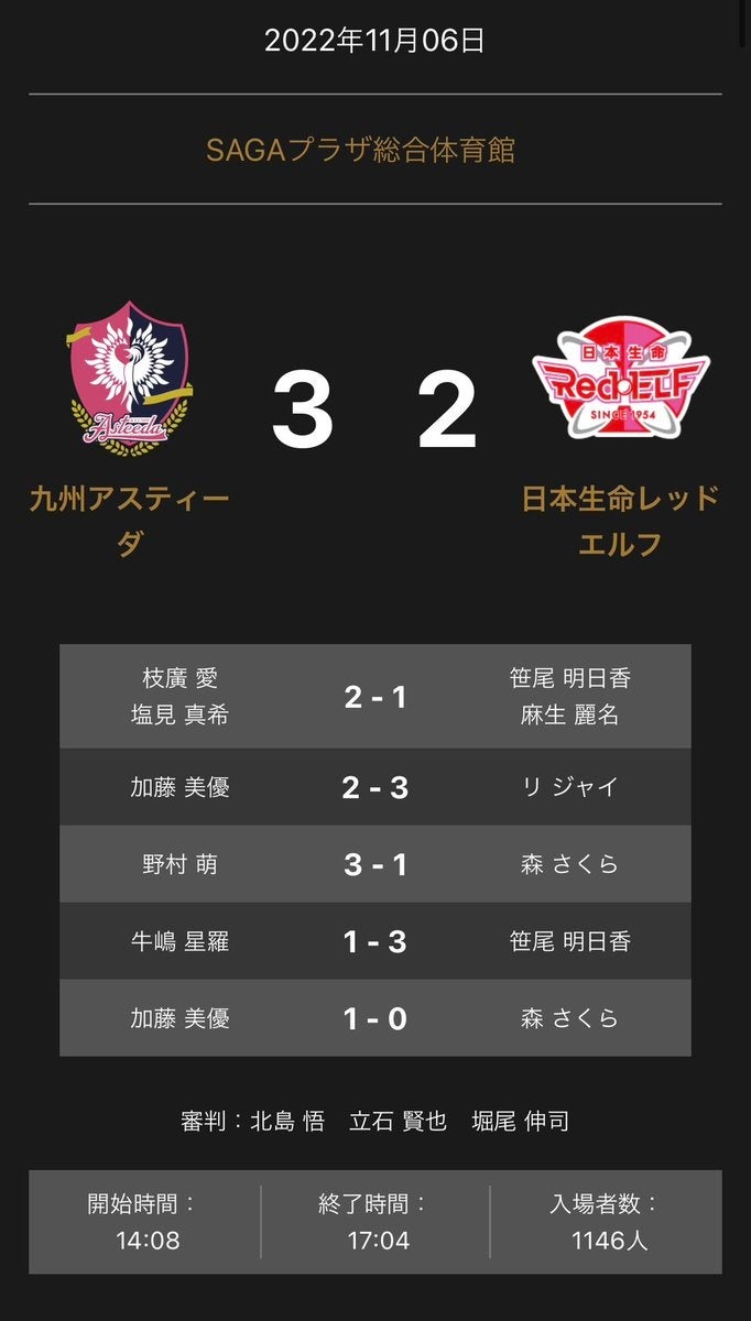 ノジマTリーグ 2022-2023シーズン 公式戦 11月6日開催 九州アスティーダ vs 日本生命 試合結果