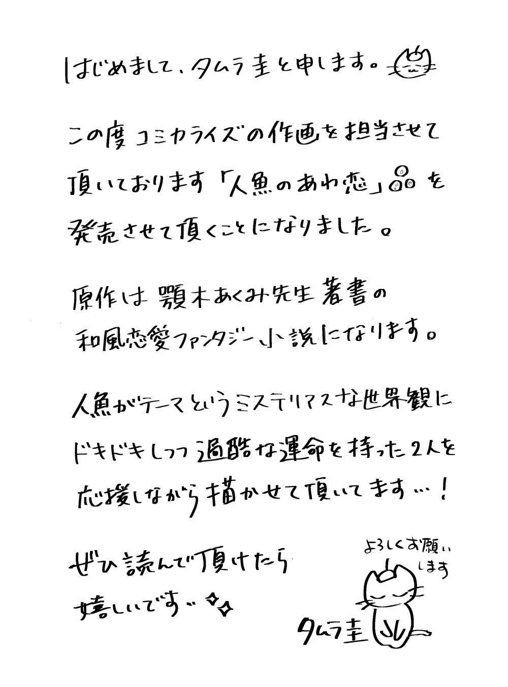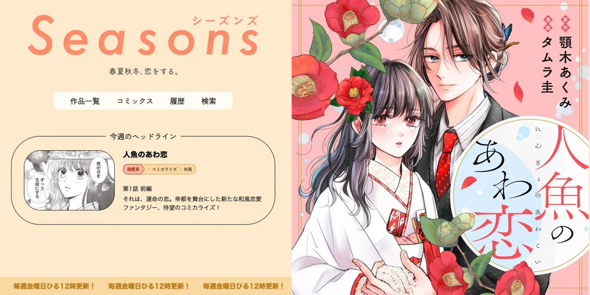 株式会社文藝春秋(本社:東京都千代田区 社長:飯窪成幸)は、顎木あくみさん原作・タムラ圭さん漫画の『人魚のあわ恋』を、電子コミック配信サービス「めちゃコミック(めちゃコミ)」にて、本日2月21日から独占先行配信します。以降、毎月第3金曜に最新エピソードを配信予定です。