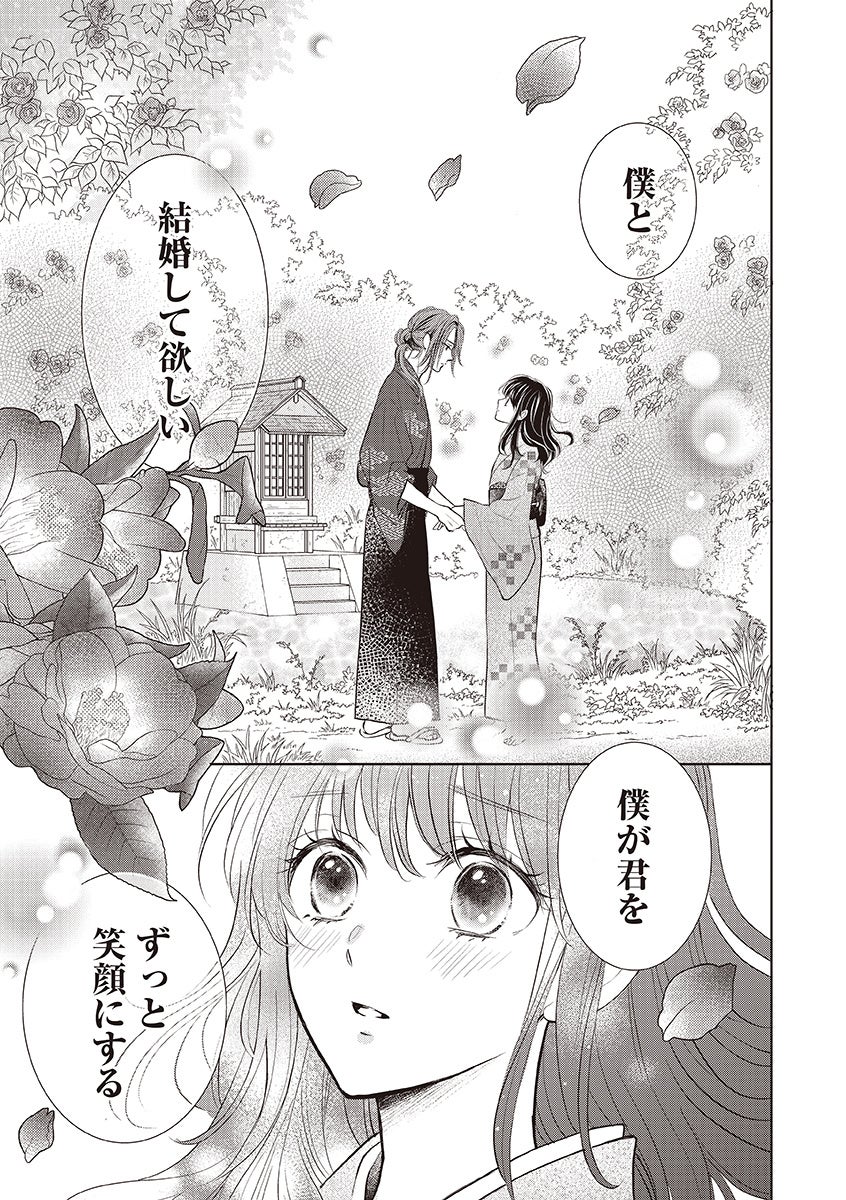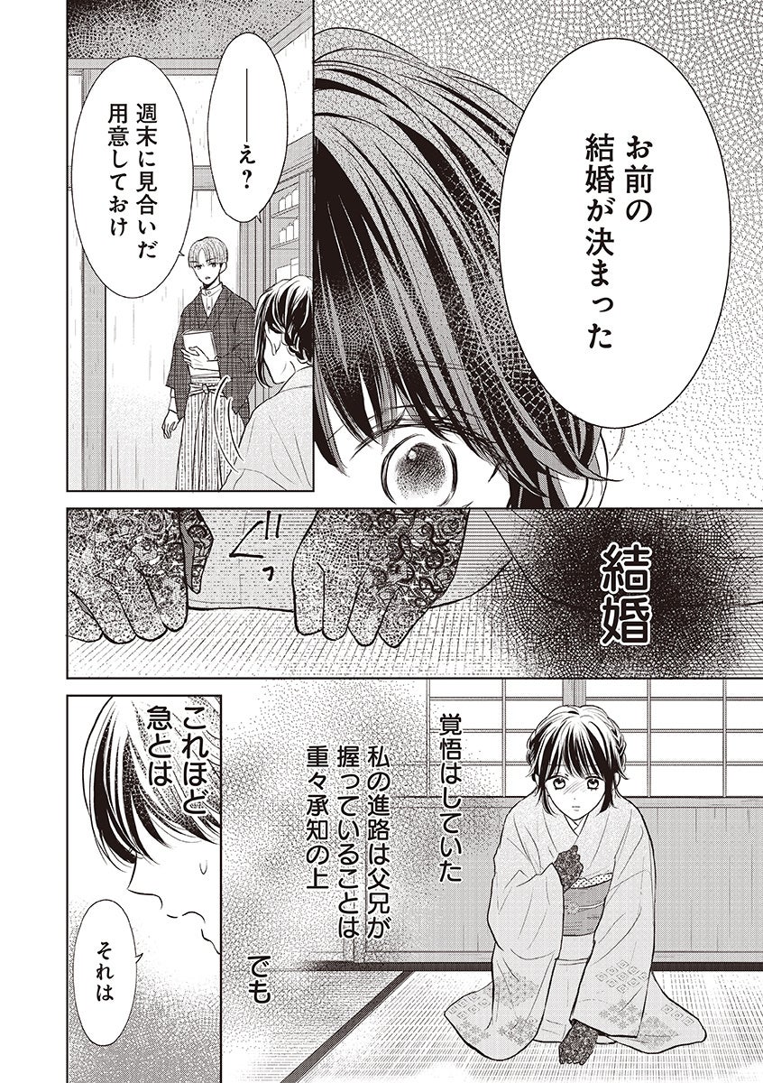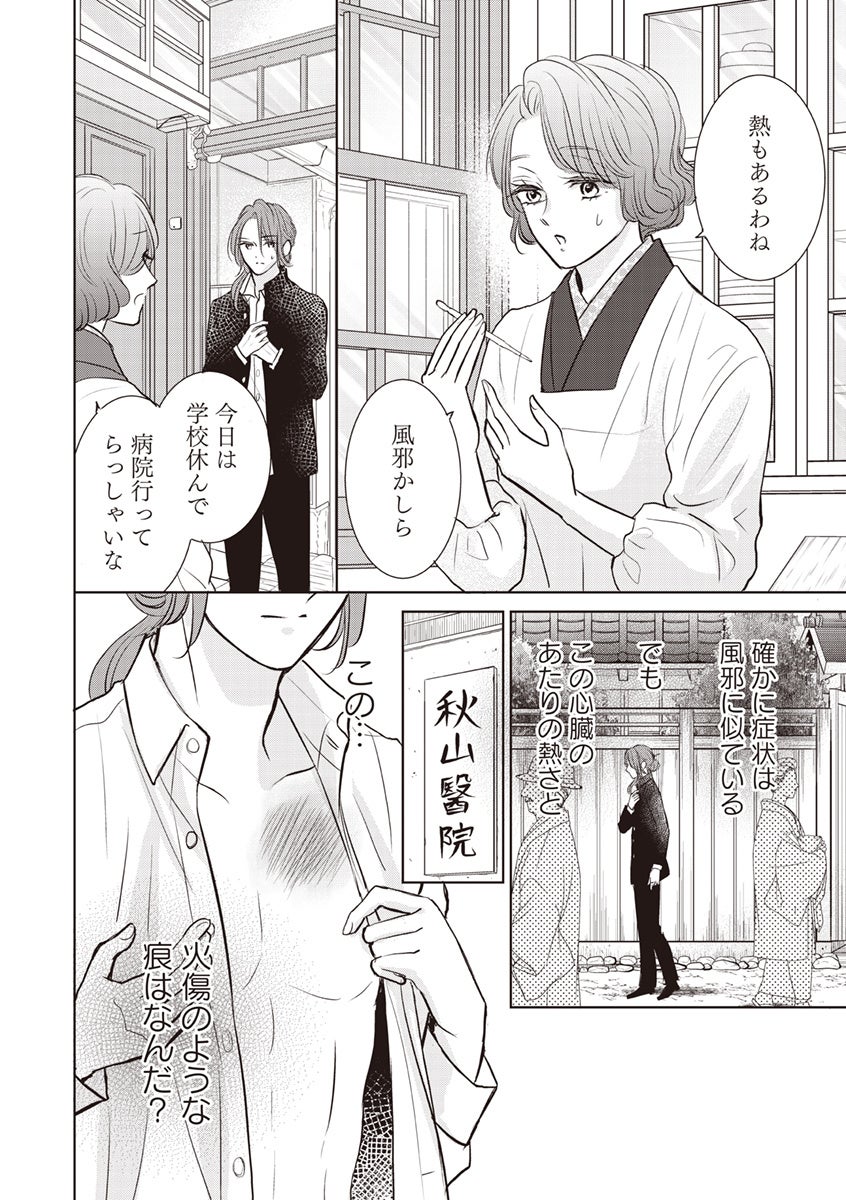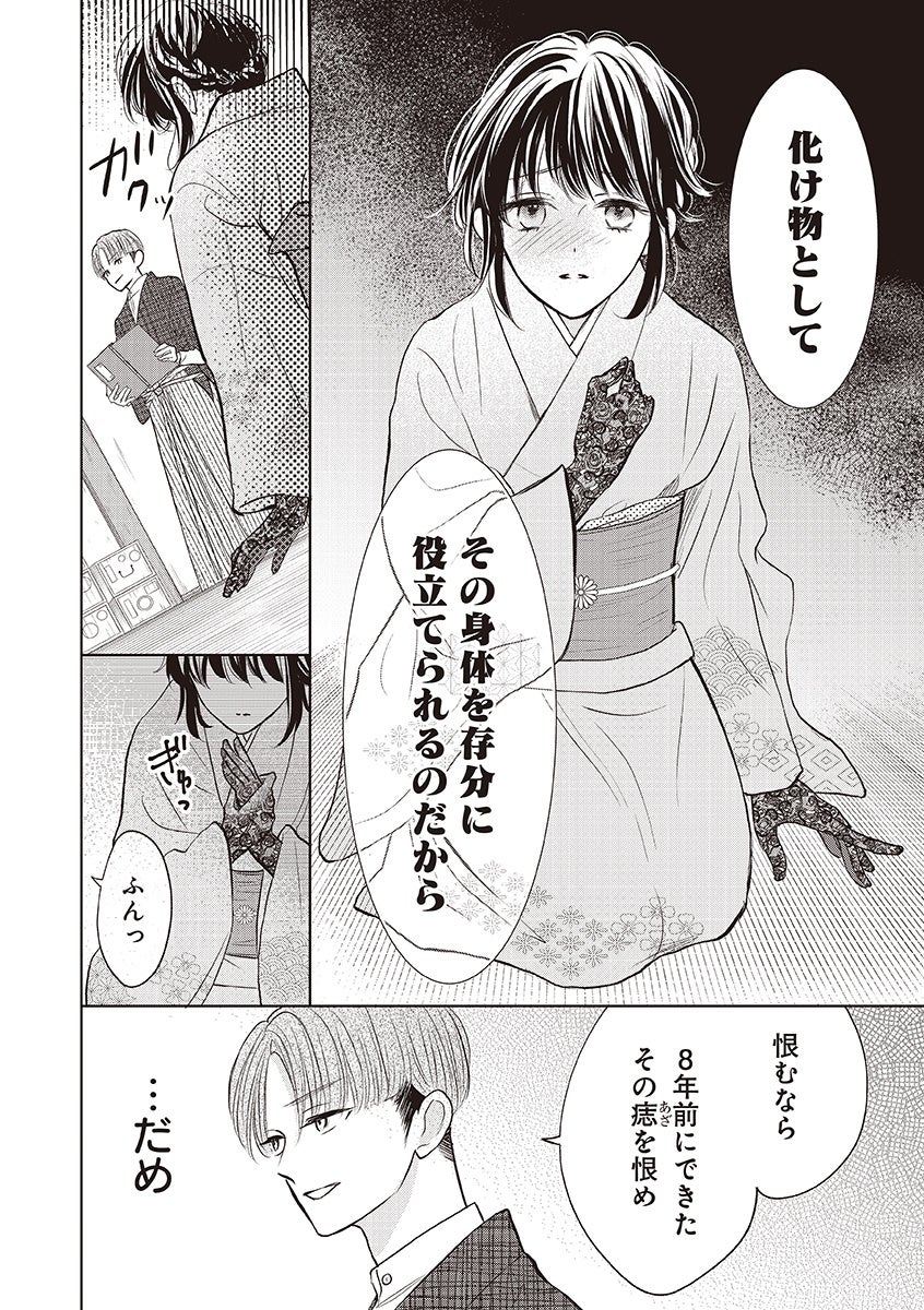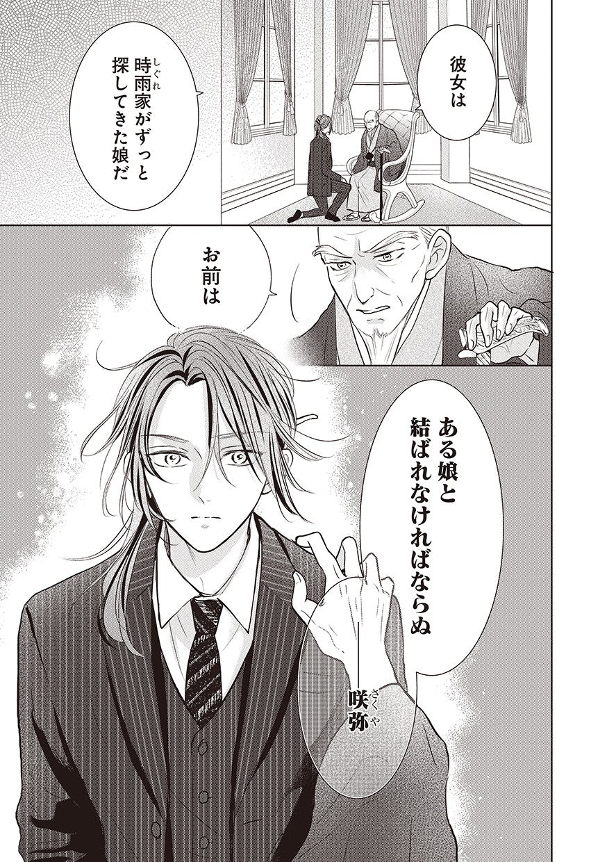 夜鶴女学院に通う天水朝名16歳。 手首に浮かんだ痣のために家族から虐げられていた。女生徒たちが新しく赴任する美男子の国語教師・時雨咲弥の話題に花を咲かせる中でも、ひとり距離を置く。 ある日、朝名に思いがけない縁談が舞い込む。それは薬問屋を営む天水家に好都合な話で……。