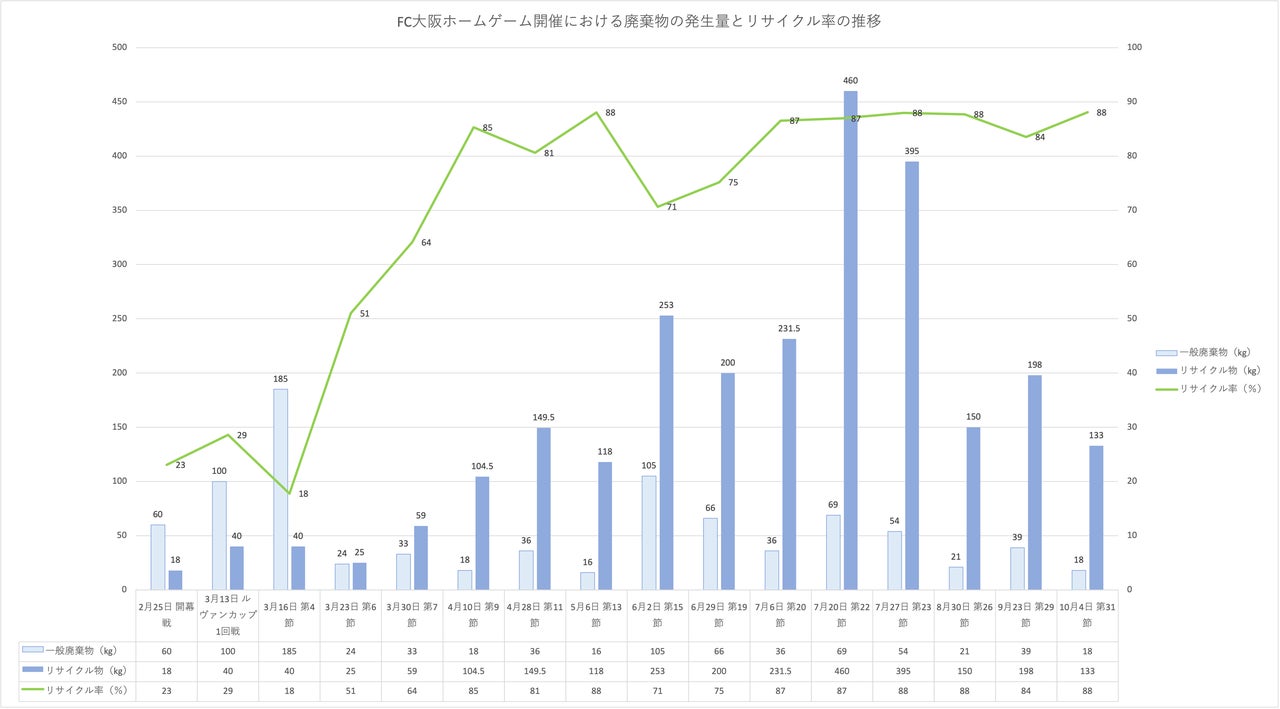 本年より取り組むエコ循環プロジェクトでは将来的な100%リサイクルを目指した第1段階としてゴミの分別に注力しております。今年の開幕戦においてゴミ全体に対してリサイクル物を分別できていた割合は23%でありましたが、取り組みの結果88%まで上昇しております。(2024年10月4日開催時時点)