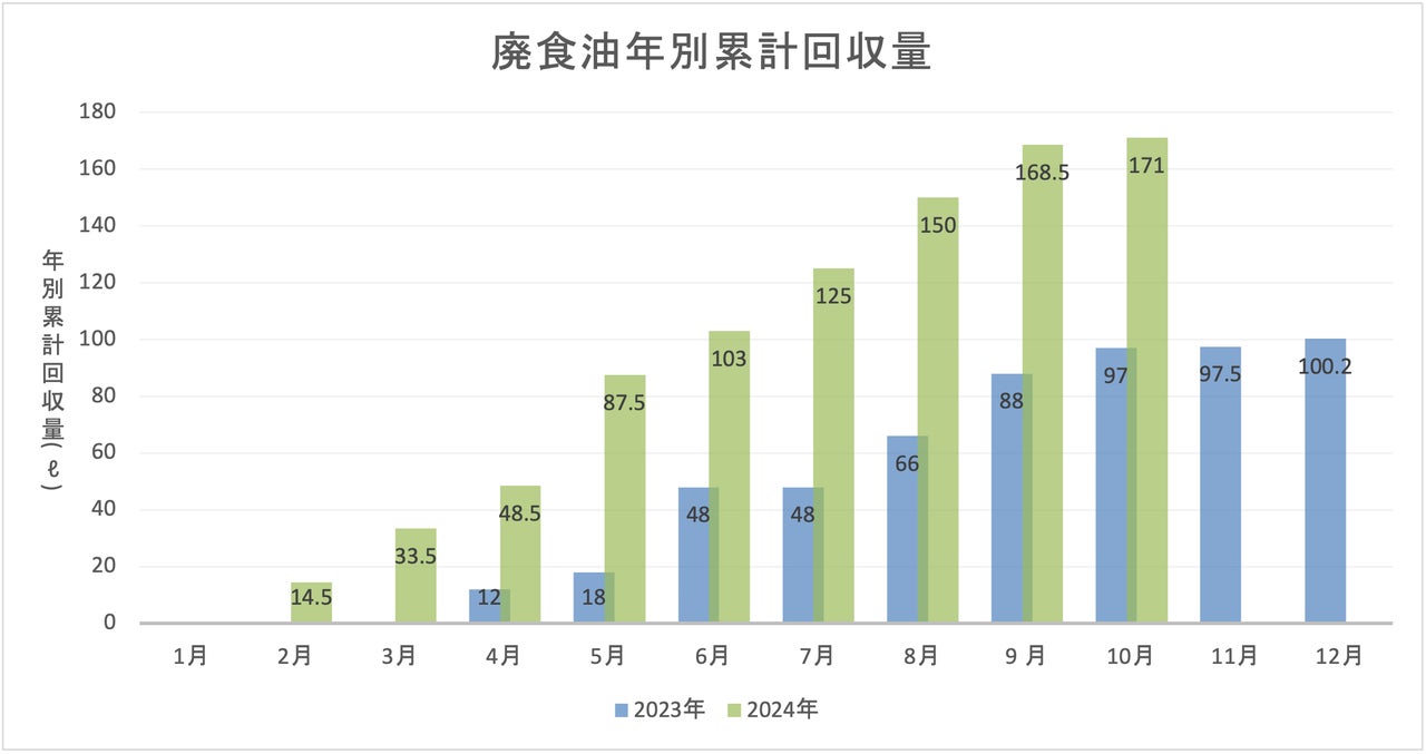 これまでの累計回収量は2023年が100.2ℓ、2024年が171ℓ(10月10日時点)で合計271.2ℓとなっておりますが、回収した廃食油はパートナー企業の植田油脂株式会社にてリサイクルされバスやトラックの燃料として資源循環しております。